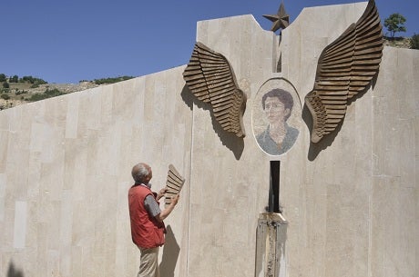 Bi beşdariya parlamenterên HDPê di merasimekê di 1ê Tebaxa 2015ê li ser diwarên gora Sakine Cansiz wêneyê wê, stêrk û çengên keovak hatibû çêkirin.