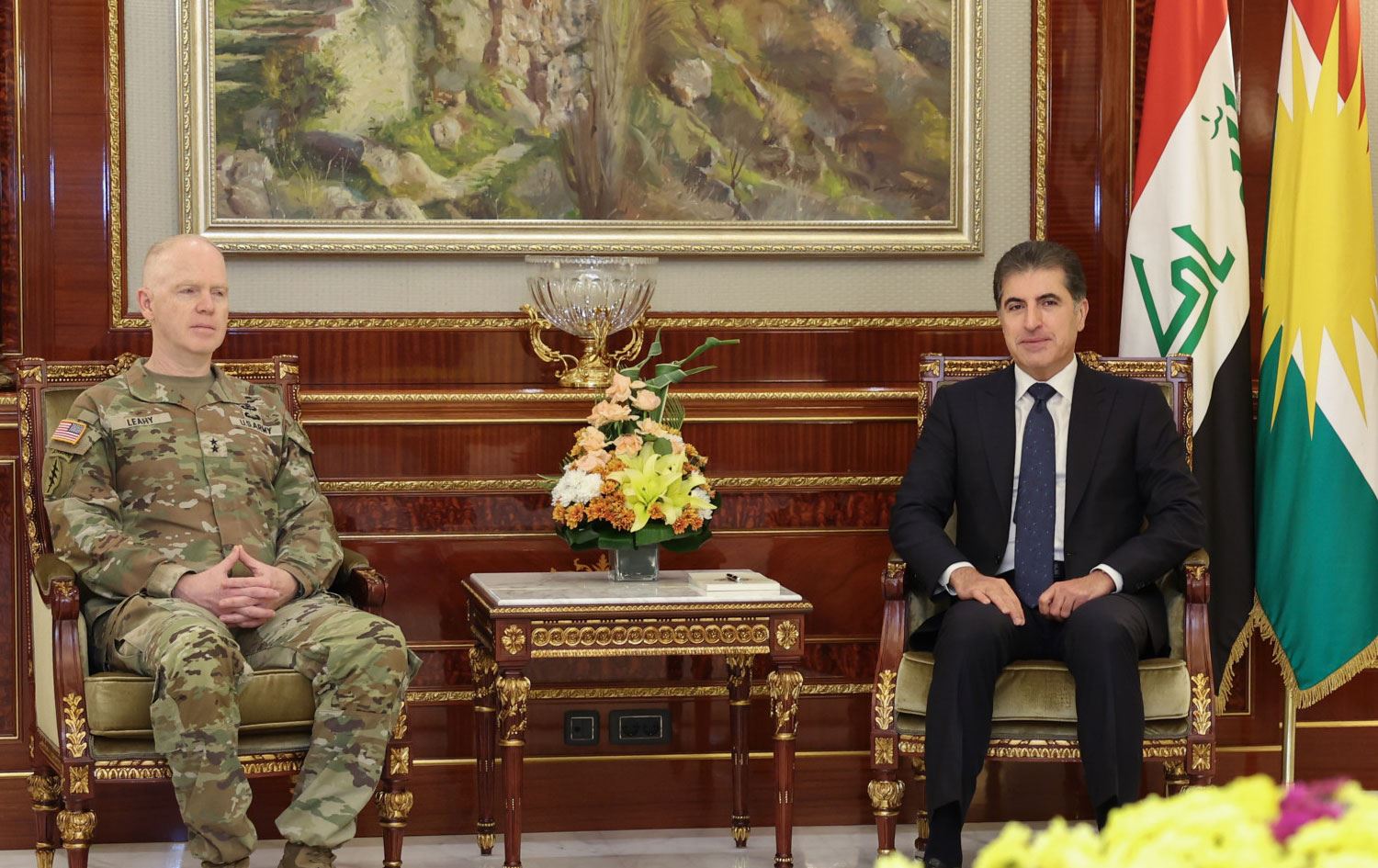 Hewlêr (Rûdaw) - Serokê Herêma Kurdistanê Nêçîrvan Barzanî bi Fermandarê Giştî yê Hêzên Hevpeymaniya Navneteweyî (Koalîsyon) ê Îraq û Sûriyeyê General Kevin Leahy re civiya.