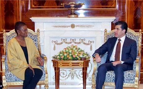 Hewlêr (Rûdaw) - Nêçîrvan Barzanî Serokwezîrê Herêma Kurdistanê, îro pêşwaziya Valerie Amos Cîgira Sekretere Giştî ya NYyê û şanda pêre kir. Barzanî got, Hikûmeta Herêmê deriyên xwe bo hemû koçber û penaberan vekiriyê û ligel derfetên sînordar çi ji destê wan hatiye pêşkêş kirine.