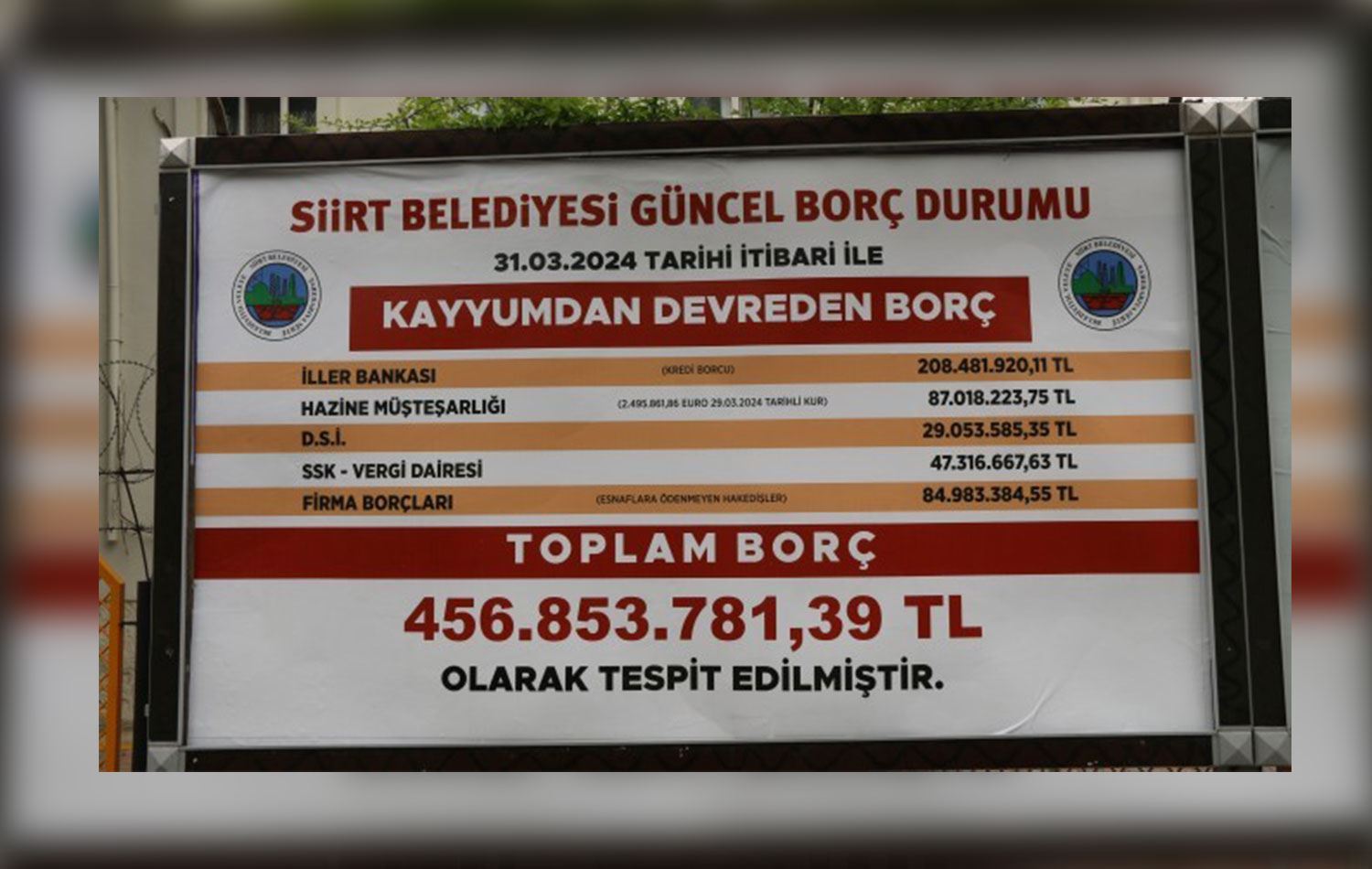 Di afîşên bi sernavê "Rewşa Deynê Niha ya Şaredariya Sêrtê" de hat diyarkirin ku qeyûm 456 milyon û 853 hezar û 781,39 TL deyn hiştiye.