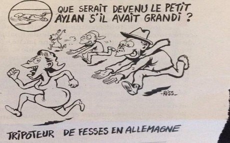 Kovara Charlie Hebdo ku çend roj berî niha karîkatoreke zarokê kurd, Alan Kurdî belav kir û têde êrişî wî kir û di karîkatorê de wiha nîşan da, ku eger Alanê 3 salî nemiriba, ew jî dê wek koçberên din kesekî binpêkerê qanûnê û destdirêjkerê ser jinan ba, rastî nerazîbûn û rexneyên têj hat.