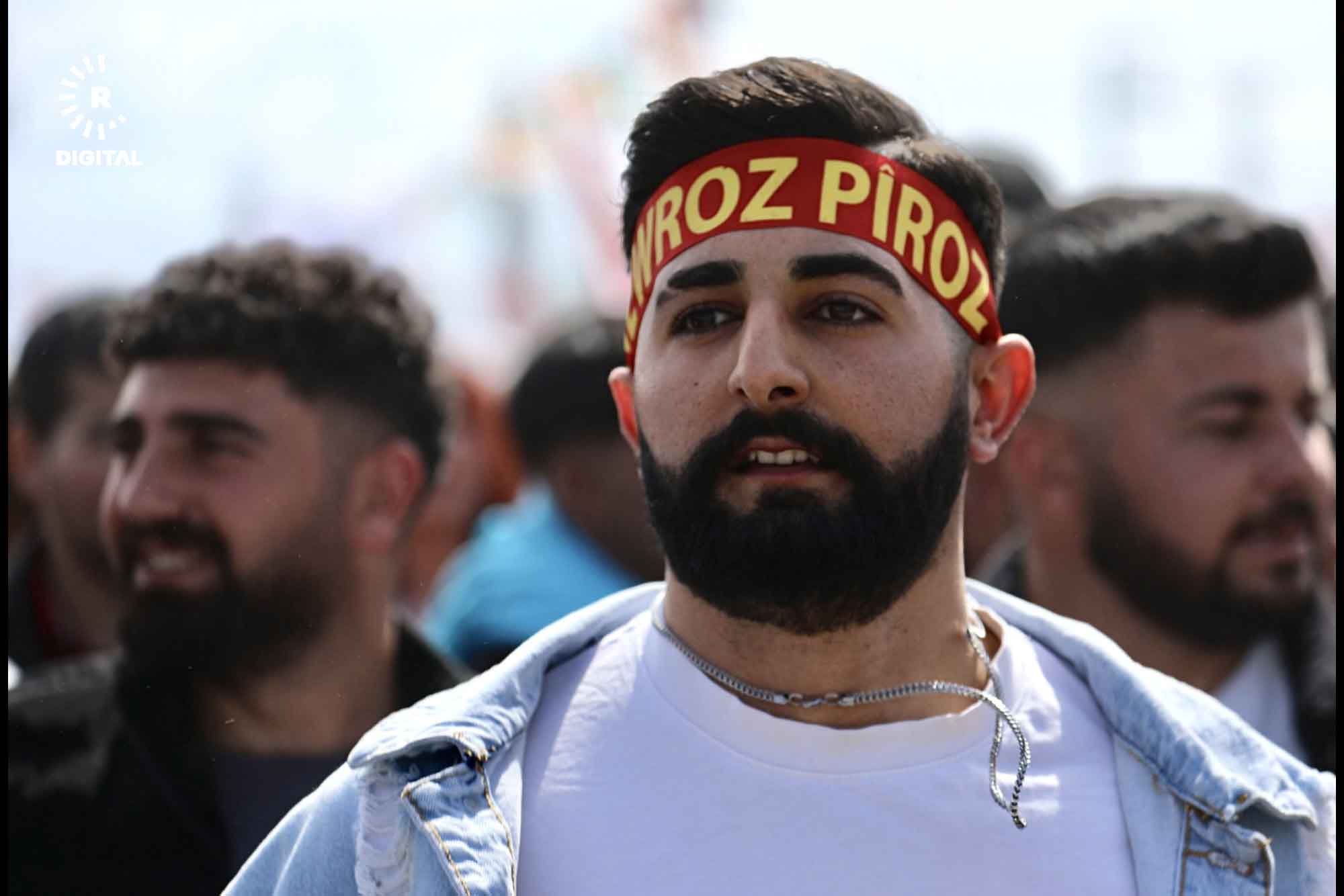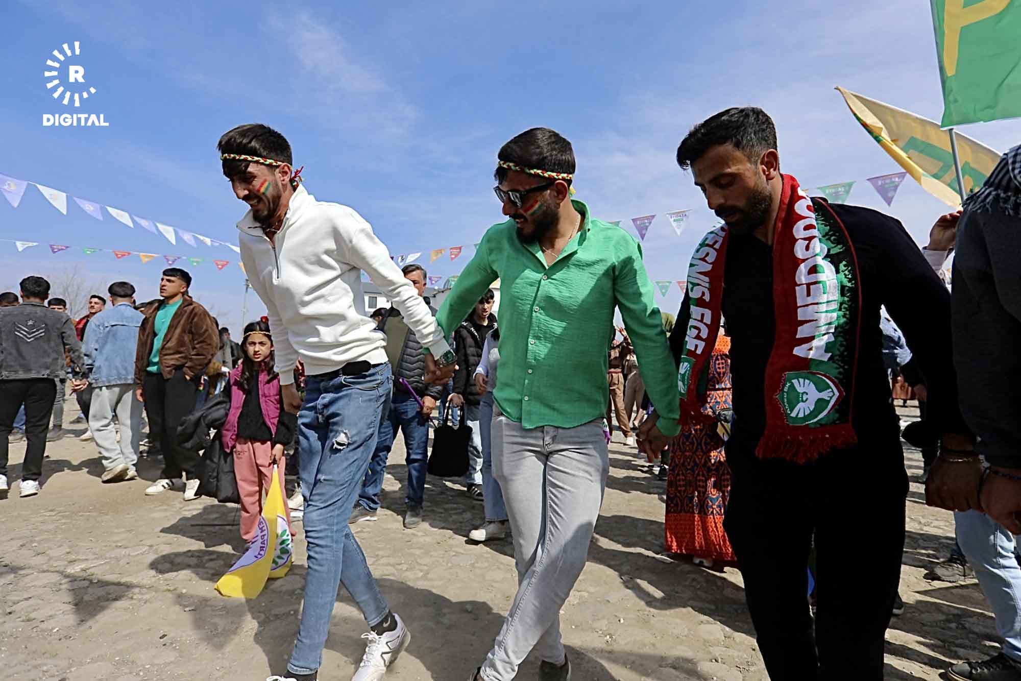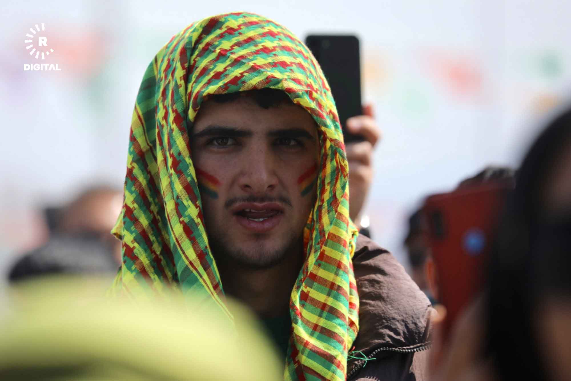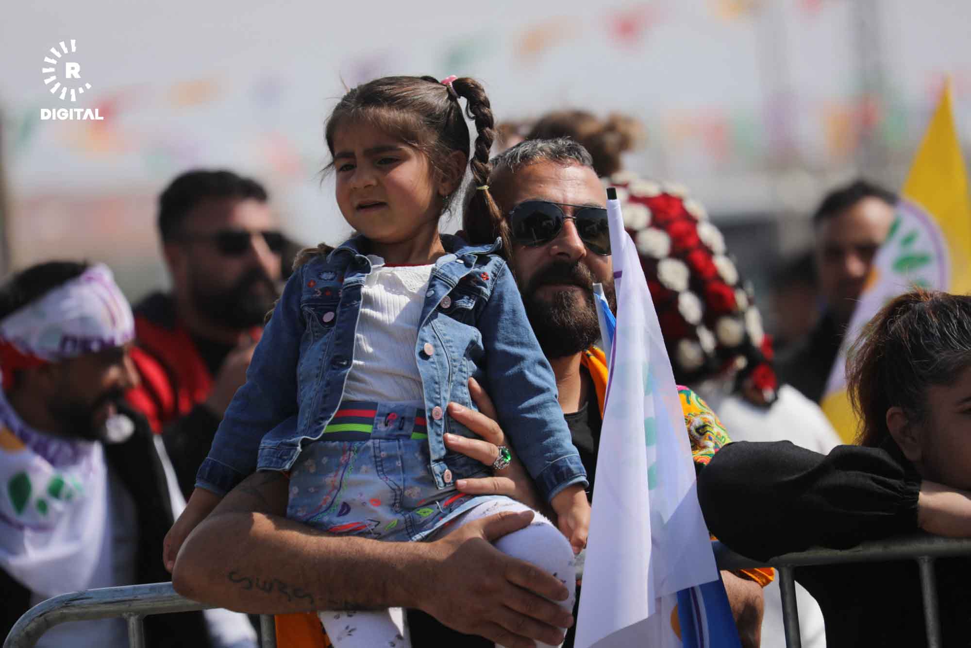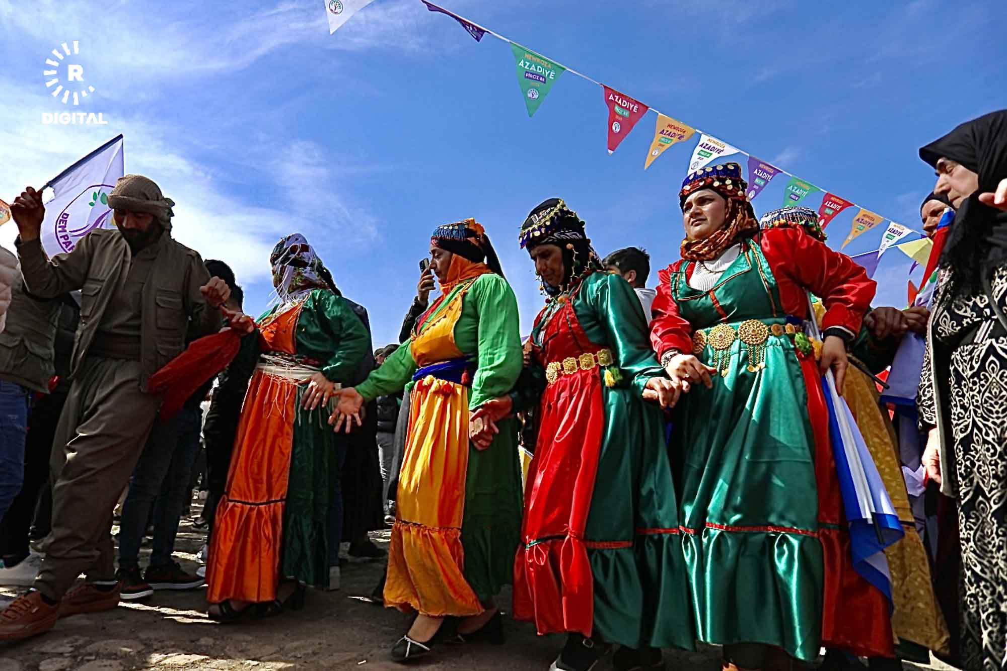 Bi hezaran Kurd ji bo Newrozê li hev civiyan û cilên rengîn ên Kurdan qada Newrozê şên kir.