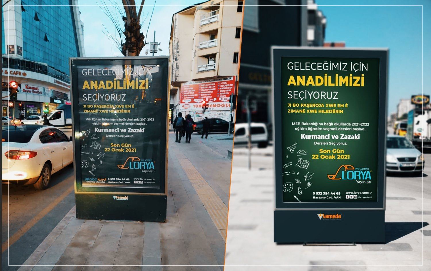 Li ser bilboardan serlêdana ji bo hilbijartina dersa zimanê Kurdî ya ku di dibistanên girêdayî wezareta perwerdehiyê de ji bo sala 2021 -2022 dest pê kiriye, hatiye bibîrxistin û hatiye nivîsandin, “Em dersên Kurmancî û Zazakî hildibijêrin.” Pêwîst e heta roja 22ê Çileya 2021an, xwandekar dersên xwe yên hilbijartî diyar bikin û rêveberîtiya dibistanan agahdar bikin.