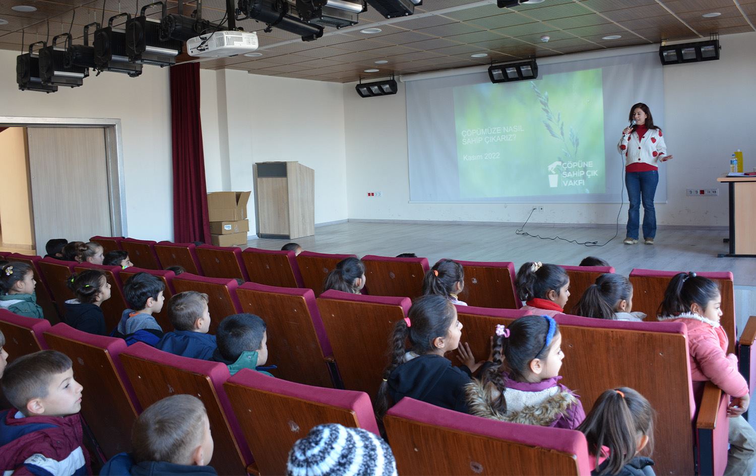 Beşek ji endamên “Weqfa Xwedî Li Paşmayên Xwe Derkeve” ji xwendekaran re behsa zirerên bikaranîna berhemên plastîkî bo xwezayê dikin.