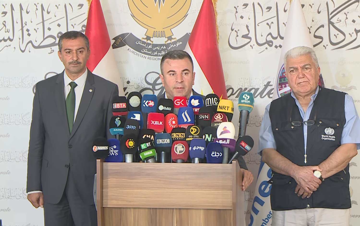 Preskonferansa Rêveberê Giştî yê Tendirustiya Silêmaniyê Sebah Hewramî bi amadebûna Parêzgarê Silêmaniyê Heval Ebûbekir, îro Yekşembî 19ê Hezîrana 2022. Wêne: Rûdaw