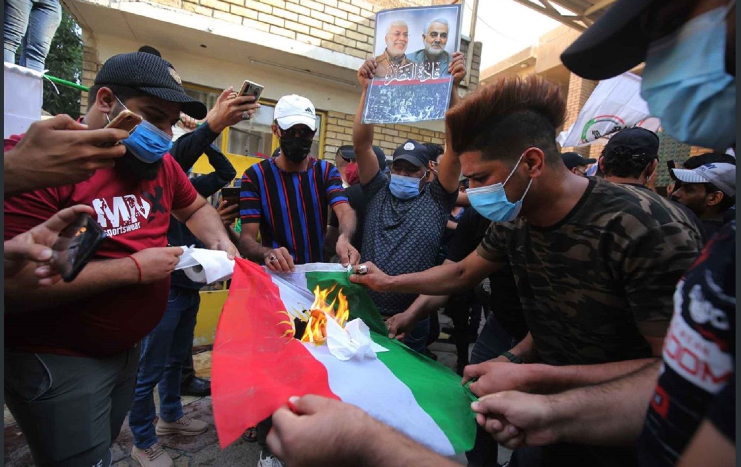 Şewitandina Ala Kurdistanê li Bexdayê ji aliyê alîgirên Heşda Şeibî ve li pêşiya baregeha PDKê. Wêne: AFP