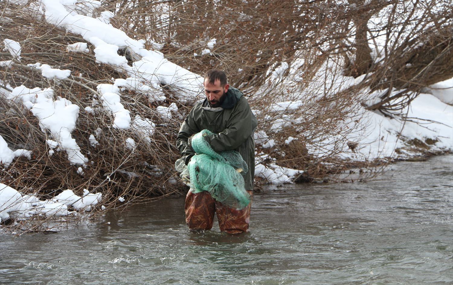 Li gundê Çataxê yê Kanîreşê di nav berf û sermaya zêde de welatî torên xwe davêjin Çemê Periyê û masiyan digirin.