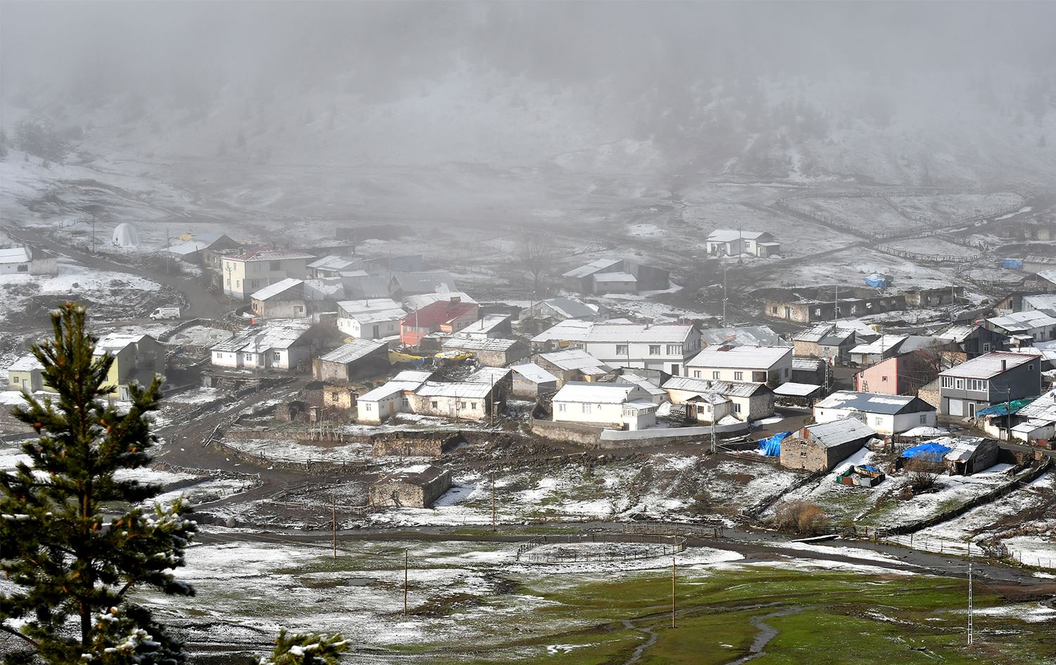 Li navçeya Qamûşanê ya Qersê ji şeva borî ve berf dibare û piştî wê jî mij û moran çêbûye.