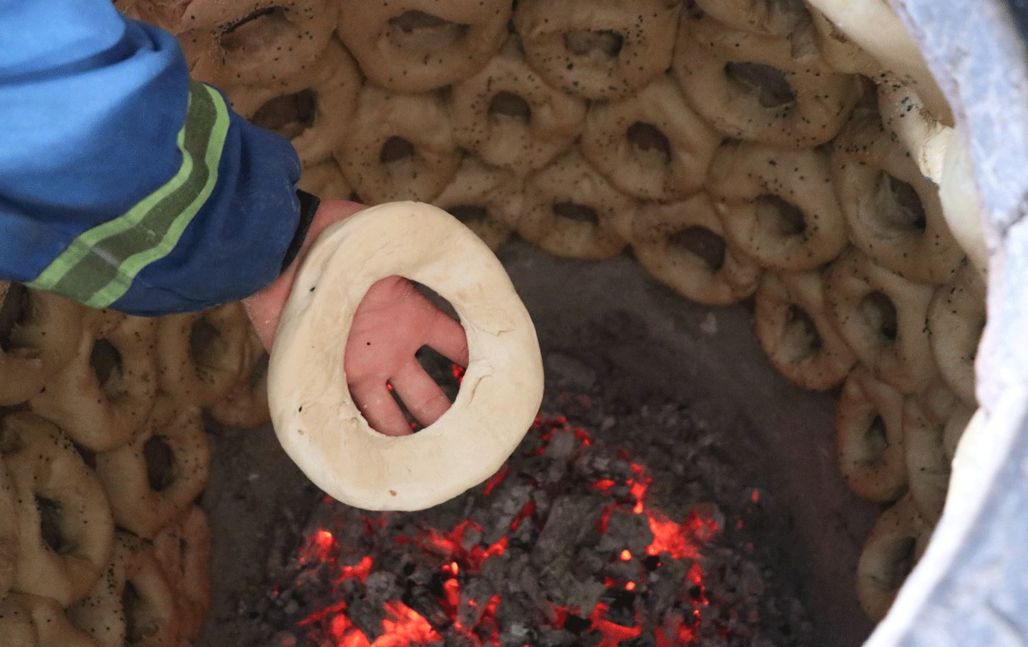 Nanpêj bi agirê êzingan tenûrên xwe har dikin da ku nanê hişk ê Sêrtê çêkin.