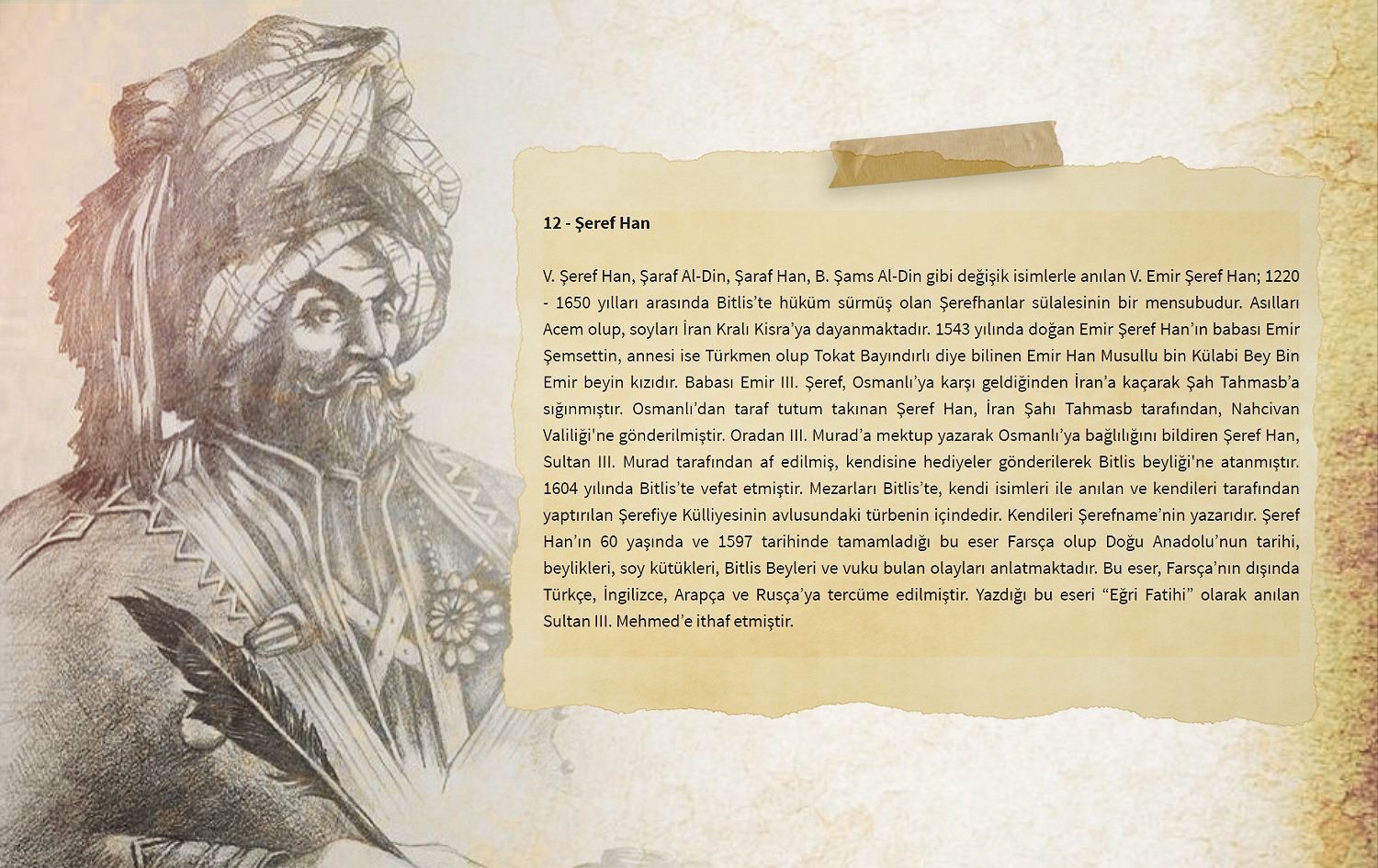 Derbarê Şerefxan de li malpera Rêveberiya Çandê ya Bedlîsê hatiye gotin, “V.Emîr Şeref Xan ku bi navên ciyawaz ên wek V.Şeref Xan, Şaraf El Dîn, Şaraf Xan, B.Şams El Dîn dihat bîranîn, endamekî binemala Şerefxanan e ku di navbera salên 1220-1650 li Bedlîsê hikum kiriye. Eslê wan Ecem e, binyata wan digihije Kîsra yê Şahê Îranê.”