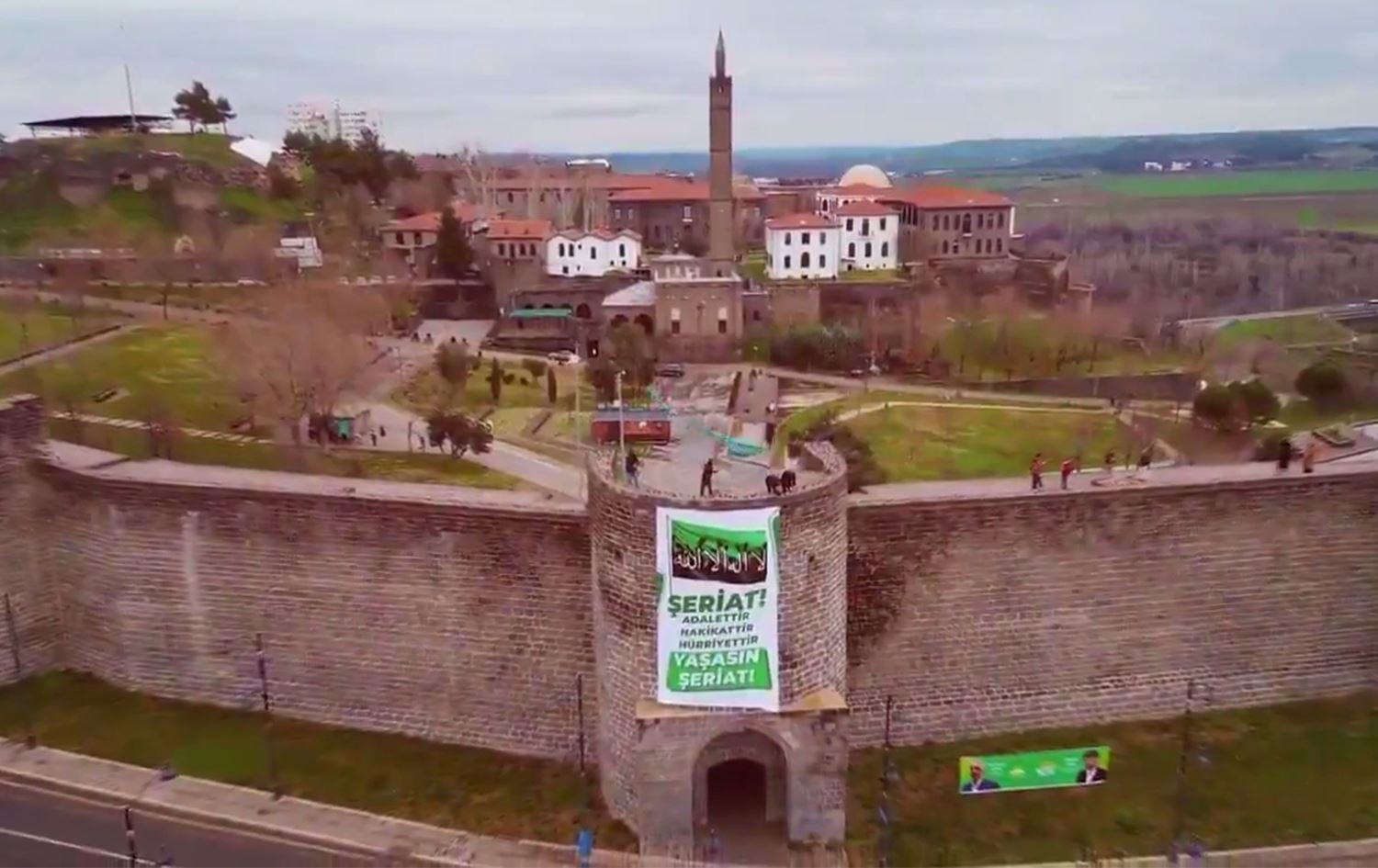 Çend hefte berê çend kesan li ser Sûrên Amedê û avahiyên çend firoşgeh û dikanên bajêr pankart û alên ku li ser wan “Bijî Şerîet û Tewhîd” hatibûn nivîsîn, daliqandibûn.