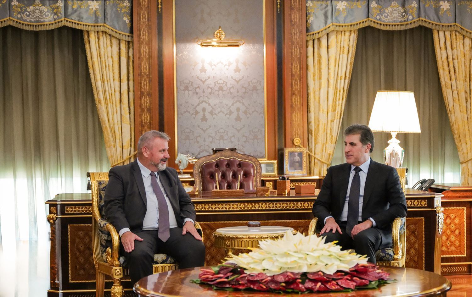 Nêçîrvan Barzanî ji bo xatirxwestinê û bidawîhatina erka wî Serokê Nûneratiya Yekîtiya Ewropayê ya Îraqê Thomas Seiler qebûl kir/Wêne: Serokatiya Herêma Kurdistanê