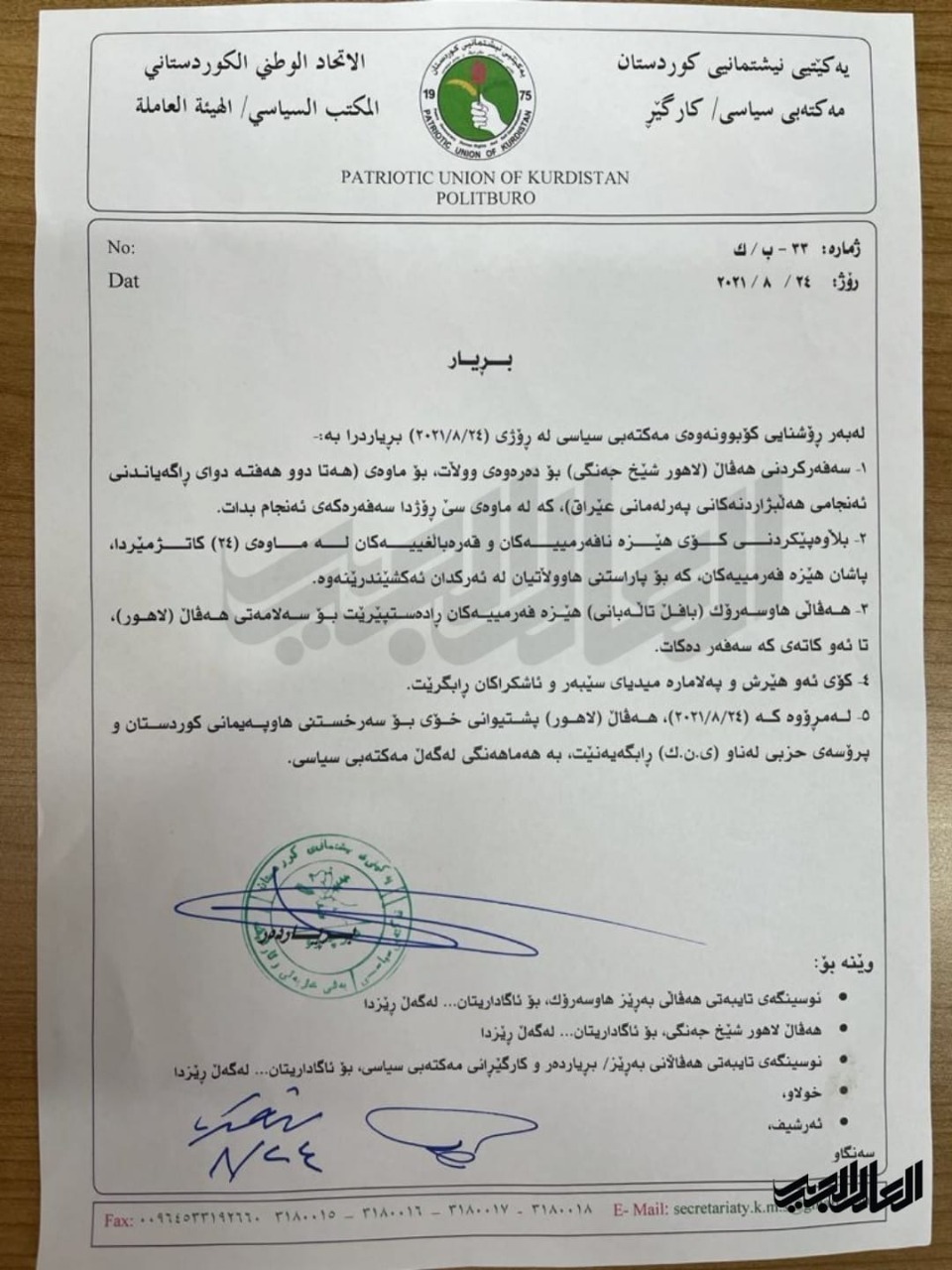 -Ji îro ve, 24/08/2021, heval Lahûr piştevaniya xwe bo serxistina Hevpeymaniya Kurdistanê û proseya hizbî li nav Yekîtiya Niştimaniya Kurdistanê radigihîne bi hemahengî li gel Polîtbûroyê