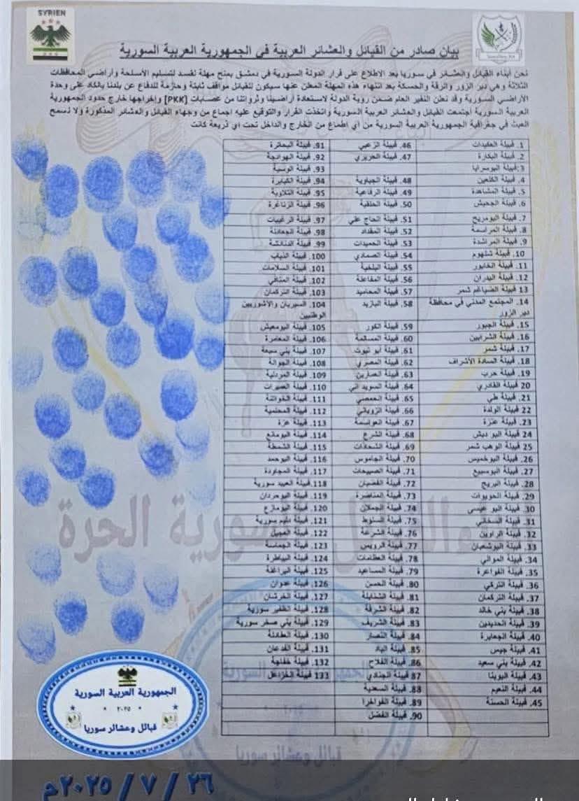 26ê Tîrmeha 2025an, daxuyaniyek li ser navê 133 êl û eşîrên Ereb ên Sûriyeyê hatibû belavkirin.