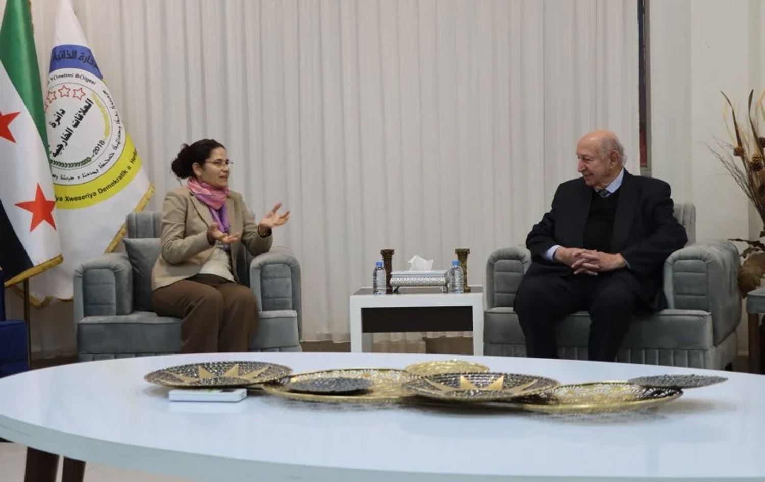 Siyasetmedar û yek ji damezrînerên YNKyê Omer Şêxmûs li Qamişloyê bi Hevseroka Daîreya Pêwendiyên Derve ya Rêveberiya Xweser Îlham Ehmedê re civiya