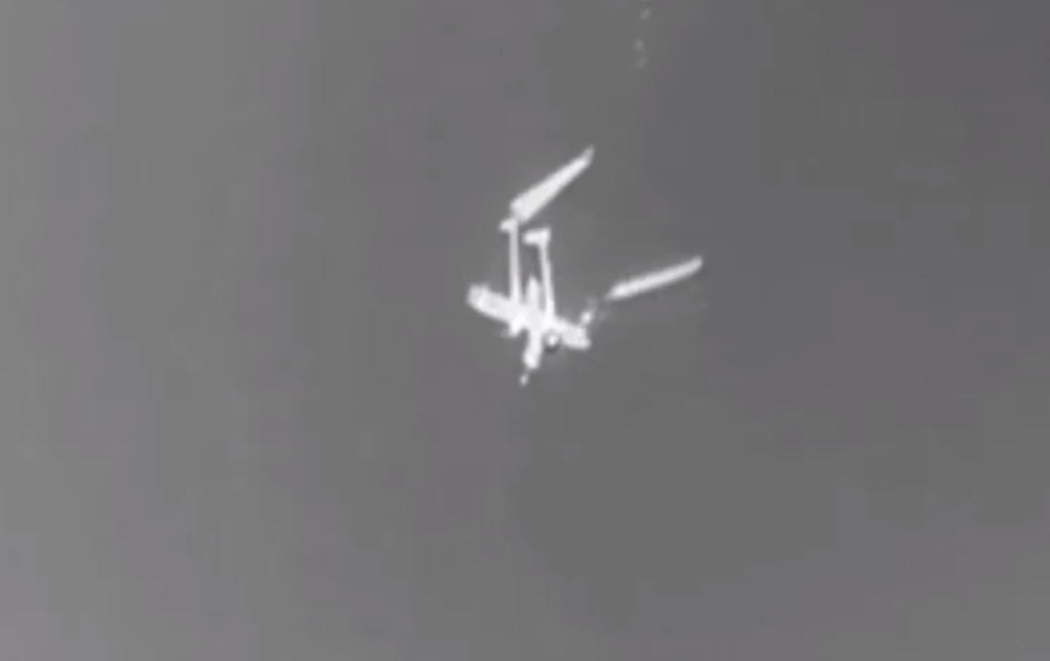 Di dîmenan de tê dîtin ku dronek tê armancgirtin û hîn li hewa ye parçe parçe dibe.