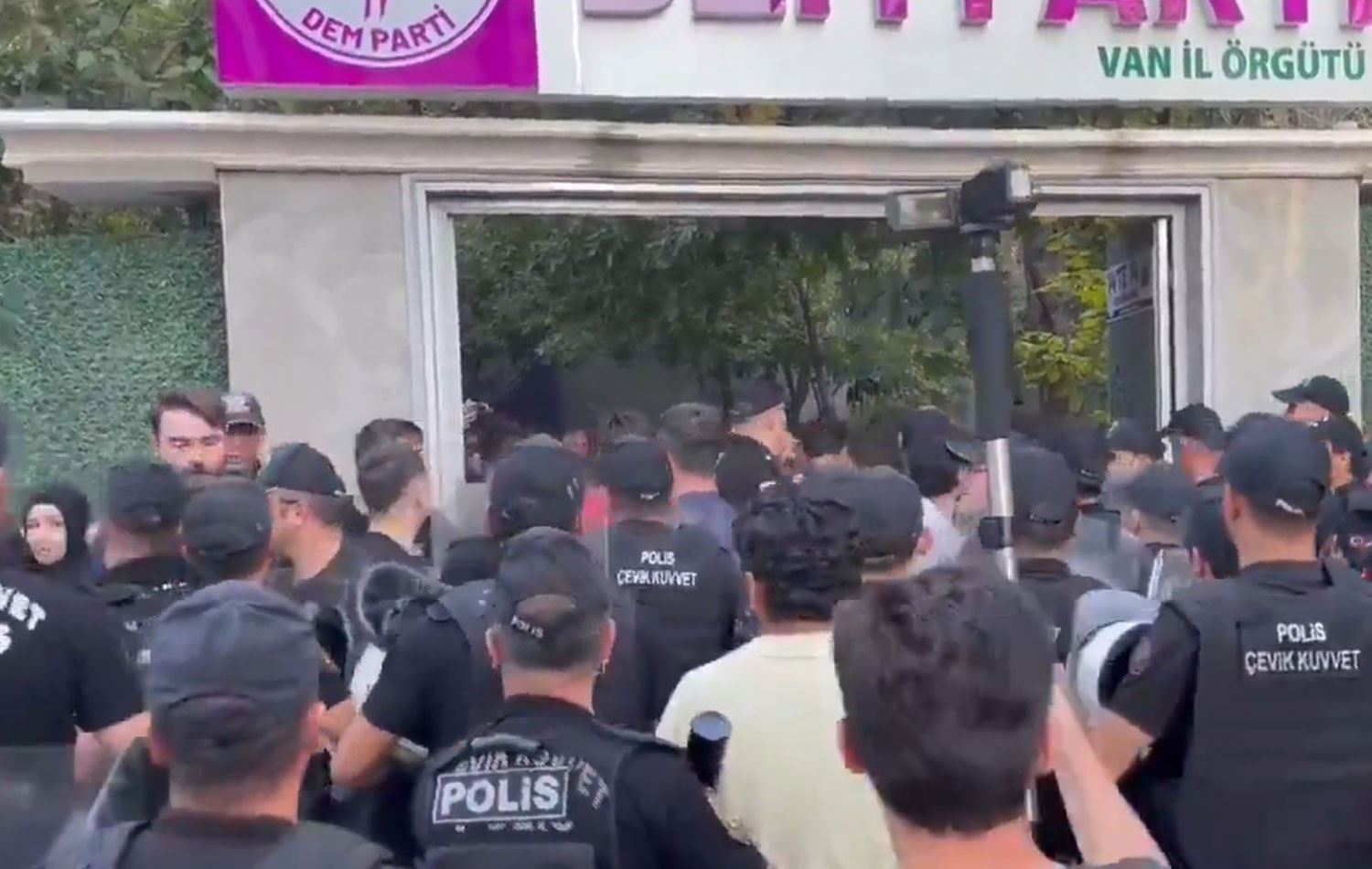 Rêxistina DEM Partiyê ya Wanê li ber avahiya xwe ya navçeya Îpekyoluyê daxuyanî da û nerazîbûn li hemberî girtina kesên ku ji ber stranan û govenda Kurdî tên girtin nîşan da.