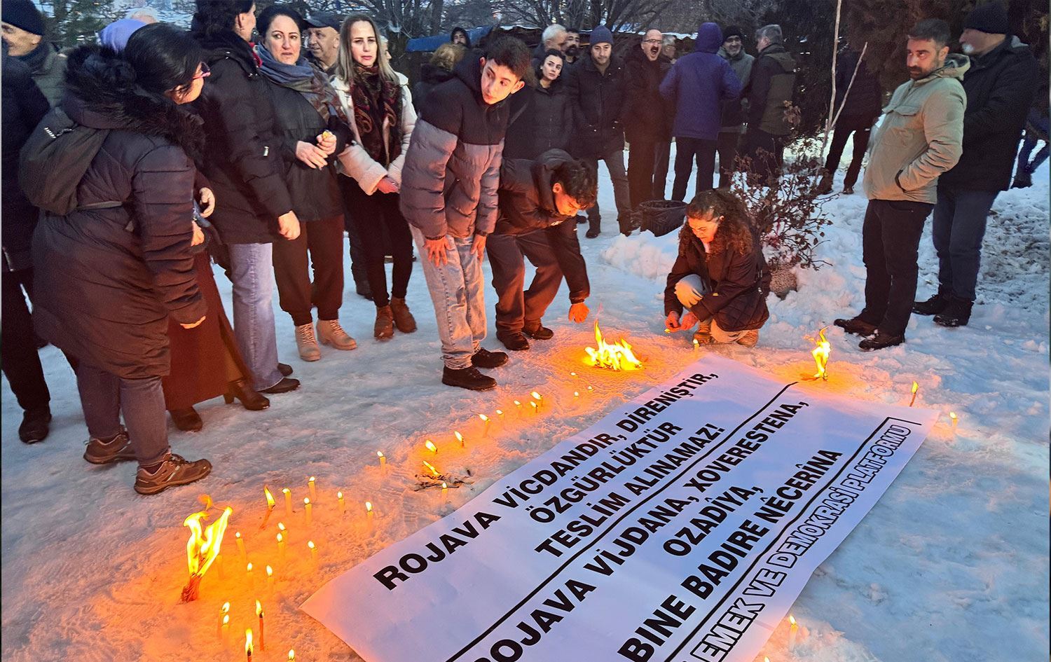 Piştî daxuyaniyan, welatiyan ji bo bîranîna kesên ku di êrişên li ser Rojavayê Kurdistanê de canê xwe ji dest daye, mum vêxistin û rêz girtin.