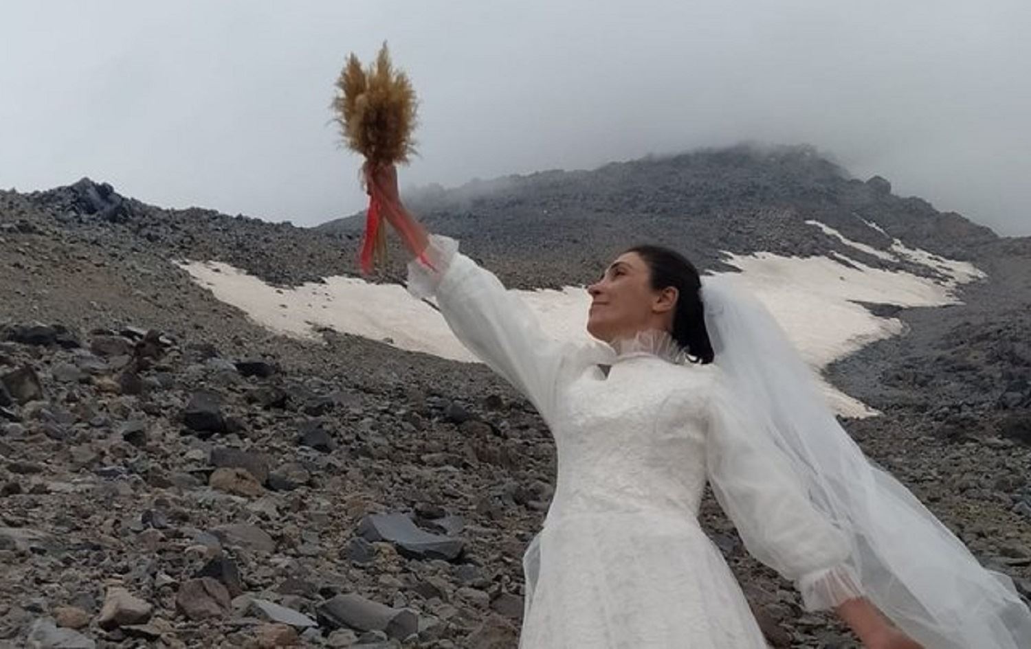 Hewlêr (Rûdaw) - Çiyager Sevgul Eraslan a 33 salî ji bo ku balê bikişîne ser tundiya li ser jin û zarokan bi awayekî sembolîk bi Çiyayê Agirî re zewicî. Sevgul Eraslan, ku li 4200 metre bilindahiya Çiyayê Agirî bûkanî li xwe kir, got: “Ez bi çiyayî Agirî re bi sembolîk zewicîm. Min xwest sûc û tundiya li ser zarok û jinan şermezar bikim."