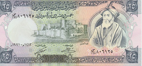 Li ser 25 lîreyê Sûrî yê 1991'ê wêneyekê Selahadînê Eyûbî û wêneyekê Kelha Kurd