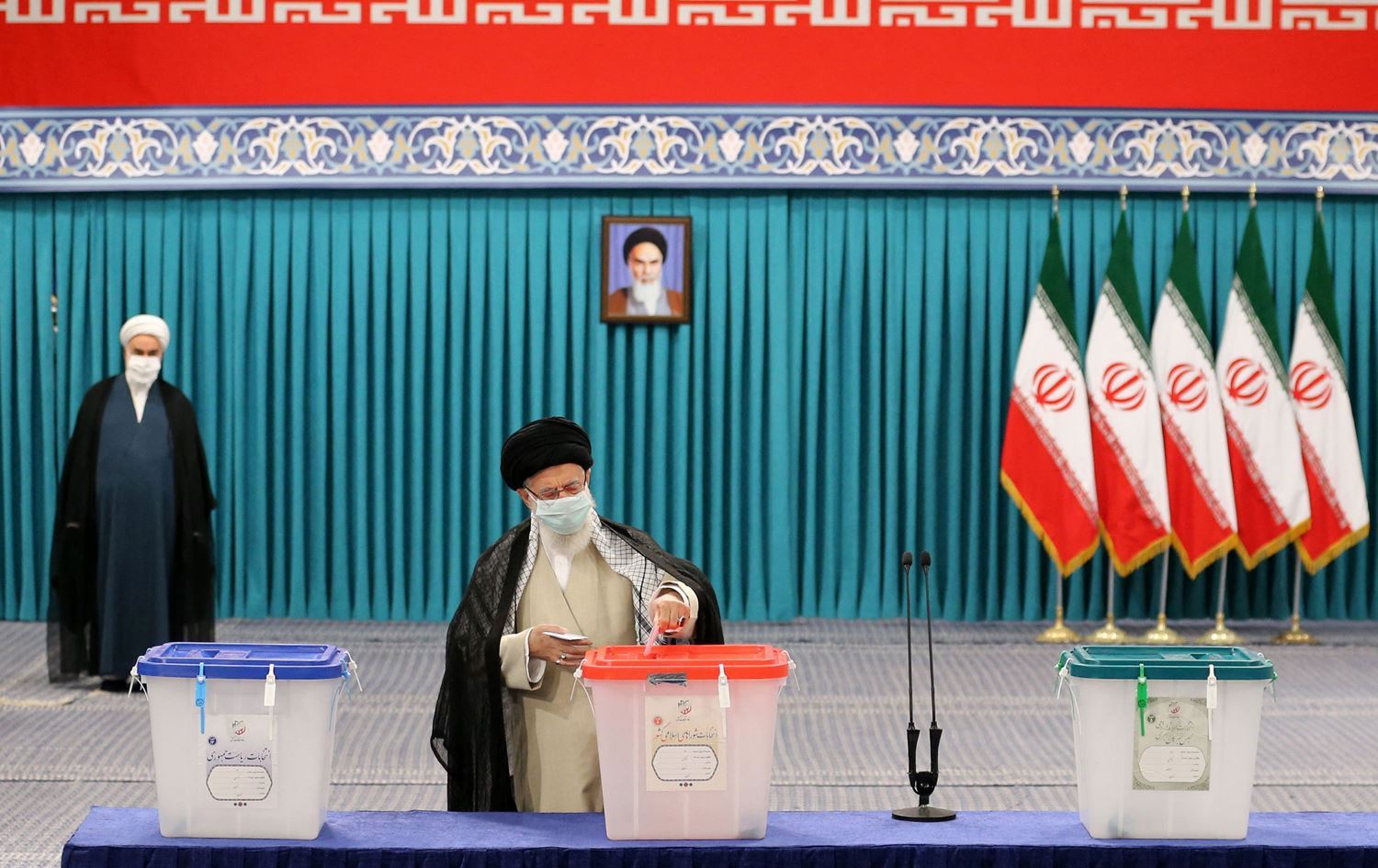 Rêberê Komara Îslamiya Îranê, Elî Xaminêyî îro li Huseyniye ya Îmam Xumêynî ya li Tehranê dengê xwe da. Wêne: AFP