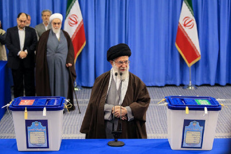 Rêberê Îranê, Elî Xaminêyî li binkeya dengdanê ya Huseyniyeya Îmam Xumêynî ya Tehranê amade bû û dengê xwe da.