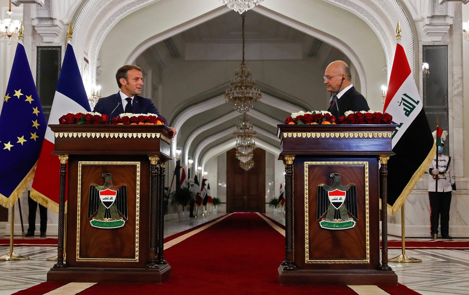 Serokê Fransayê Emmanuel Macron îro Çarşemê 2yê Îlona 2020an di çarçoveya serdaneke fermî de gihîşt Iraqê û li Koşka Bexdayê bi merasîmeke taybet ji aliyê Serokomarê Iraqê Berhem Salih ve hat pêşwazîkirin.