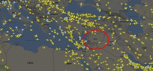 Herwiha malpera cîhanî ya taybet bi radara firokevaniyê, fightradar24.com jî wêneyek ji nexşeya rêya hatinûçûna firokeyên sivîl li esmanê herêma Rojhilata Navîn belav kir, ku têde tê nîşanda ku ti firokeyek bi ser esmanê Sûriyê re derbas nabe.