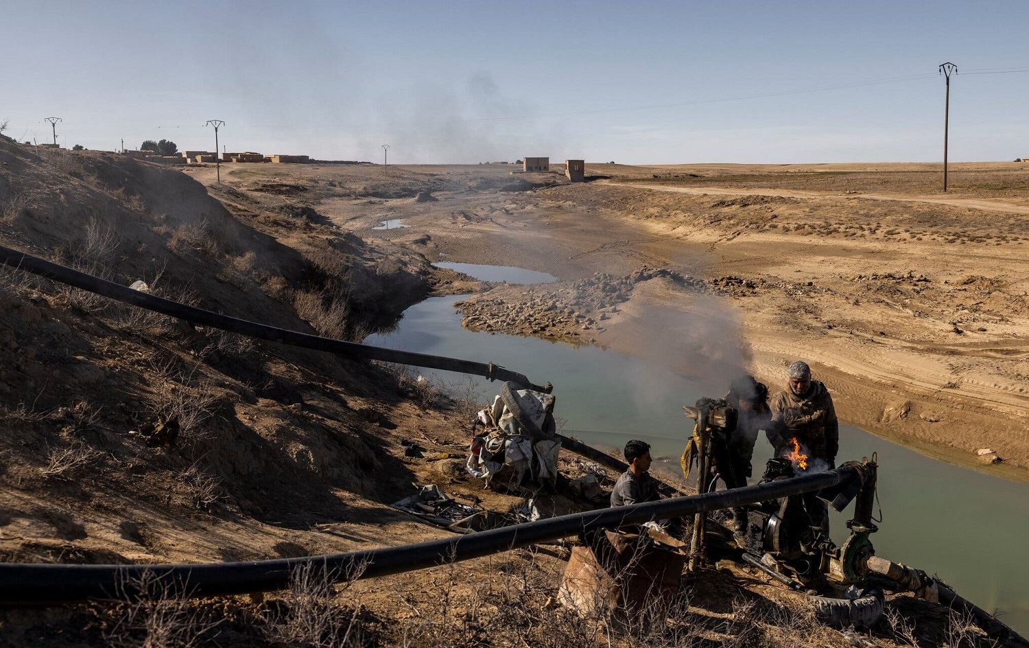 Pompeyên avdanê yên li ser çemê Xabûrê, ku ava wê heta astekê kêm bûye. Niha pêdivî ye ku pompeyên avê zêde bixebitin, ji bo ku heman mîqdara avê bistînin, lewra bêtir sotemeniya mazotê bikar tînin. Wêne: Ivor Prickett / The New York Times