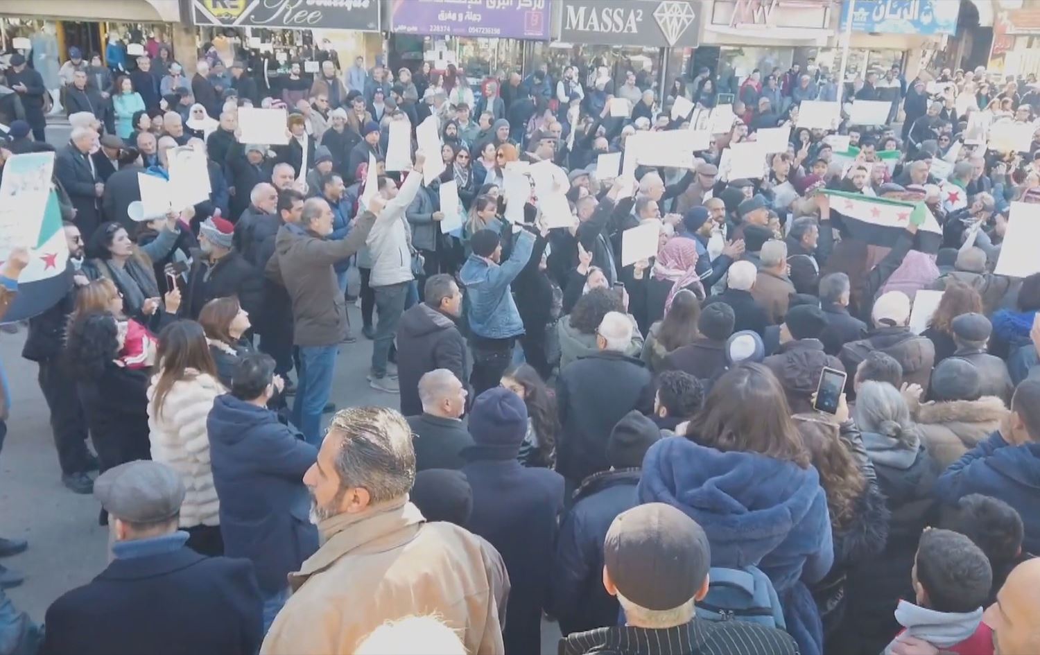 Xwenîşanderan alayên nû yên Sûriyeyê bilind kirin û sloganeke wan dibêje "Gelo başûr jî hat firotin wekî ku Golan firotin. Helwêsta hikûmeta Şamê çi ye?"