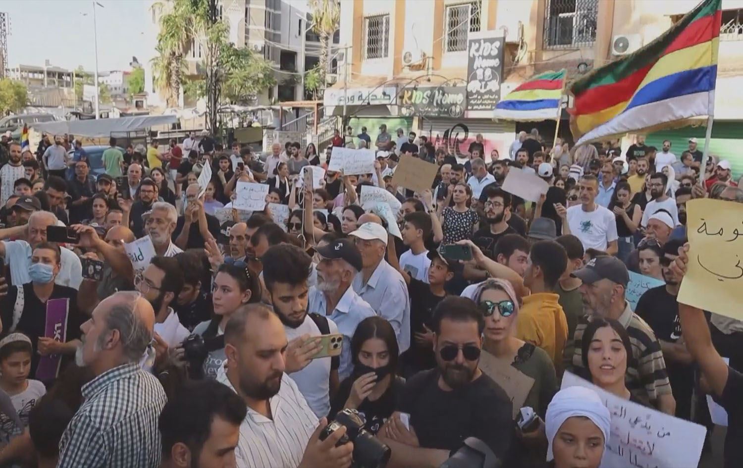 Xwenîşanderan sloganên wekî "Medya Colanî derewîn e”, "Birçîkirina bajêr tawana şer e”, “Nexweşxaneyan rizgar bikin ku berî bibin goristan”, "Divê korîdorên aram bên peydakirin”, “Dorpêçê li ser Siwêdayê rakin” û "Em Îsraîlê dixwazin” bilind kirin.