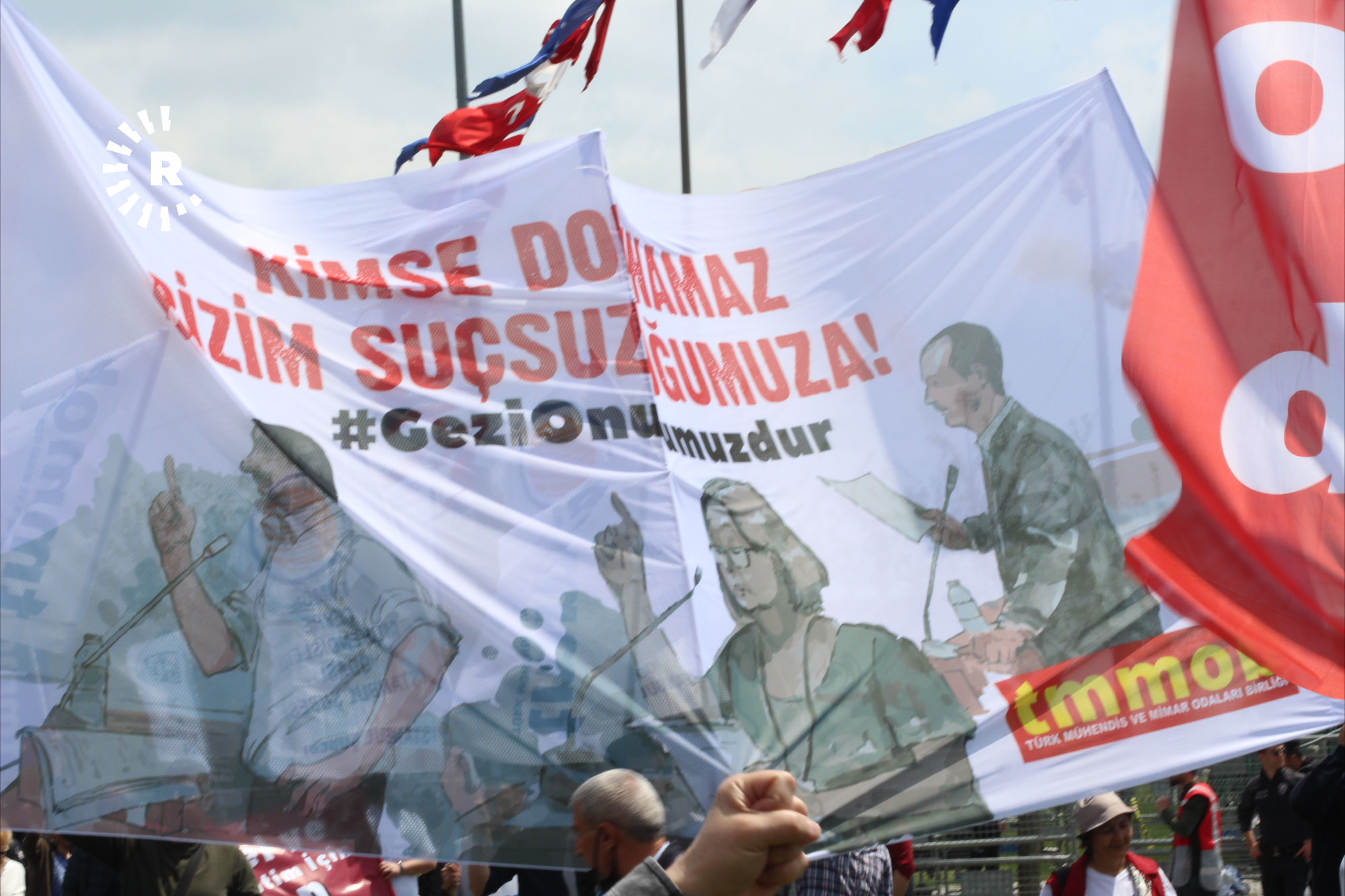 Peyamên Mucella Yapıcı, Can Atalay û Tayfun Kahraman ên ku di Doza Geziyê de cezaya 18 sal girtîgehê li wan hat birîn hatin xwendin.