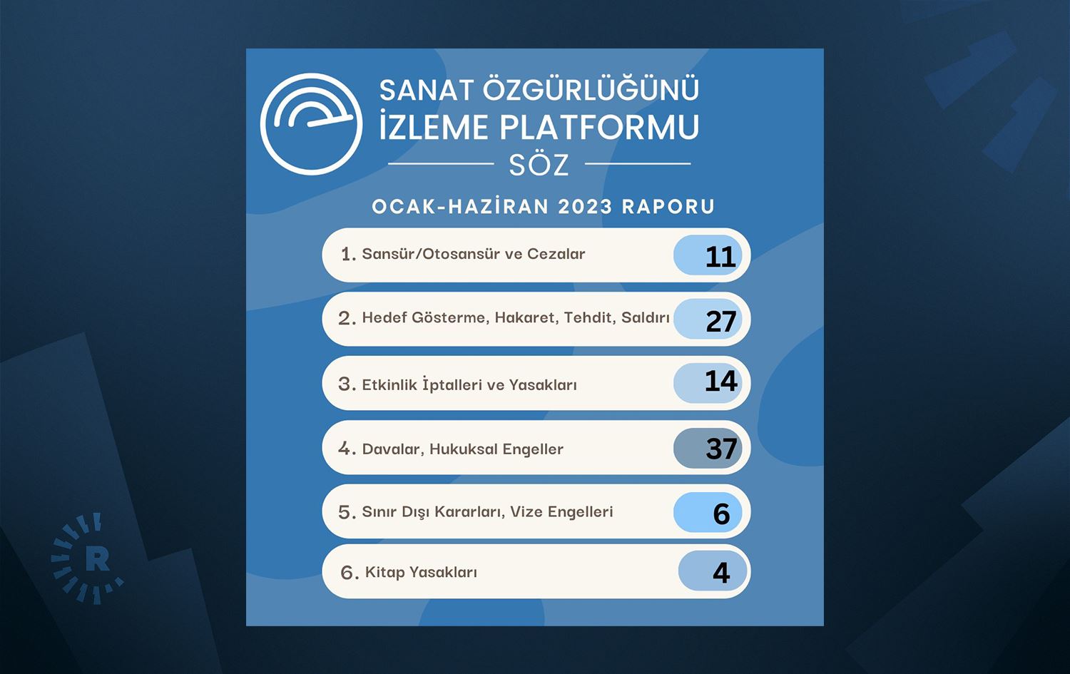 Di raporê de hatiye gotin, di şeş mehên destpêkê yên sala 2023ê de 14 çalakiyên hunerî hatine qedexekirin, 11 hatine sansûrkirin, huner 27 caran hatiye armancgirtin, 37 hunermend hatine darizandin, 6 biryarên dersînorkirin û astengkirina vîzeyê hatine dayîn û 4 pirtûk hatine qedexekirin.