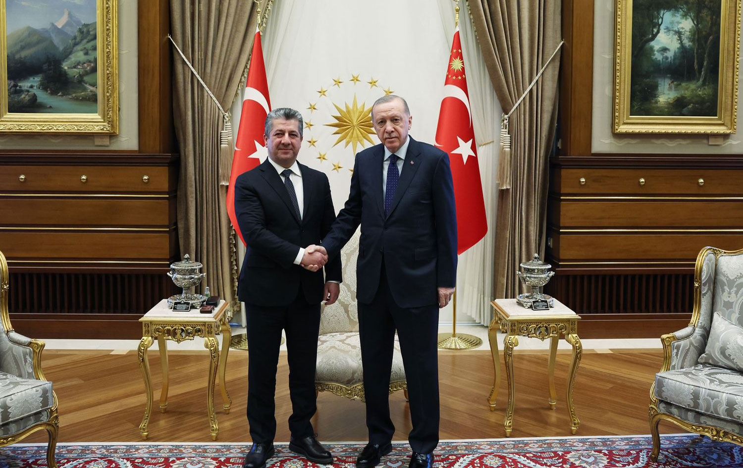 “Serokomar Recep Tayyîp Erdogan li Kuliyeya Serokomariyê, Serokwezîrê Birêvebiriya Heremî ya Kurdan a Îraqê (Mebest: Herêma Kurdistanê ye) Mesrûr Barzanî pêşwazî kir.