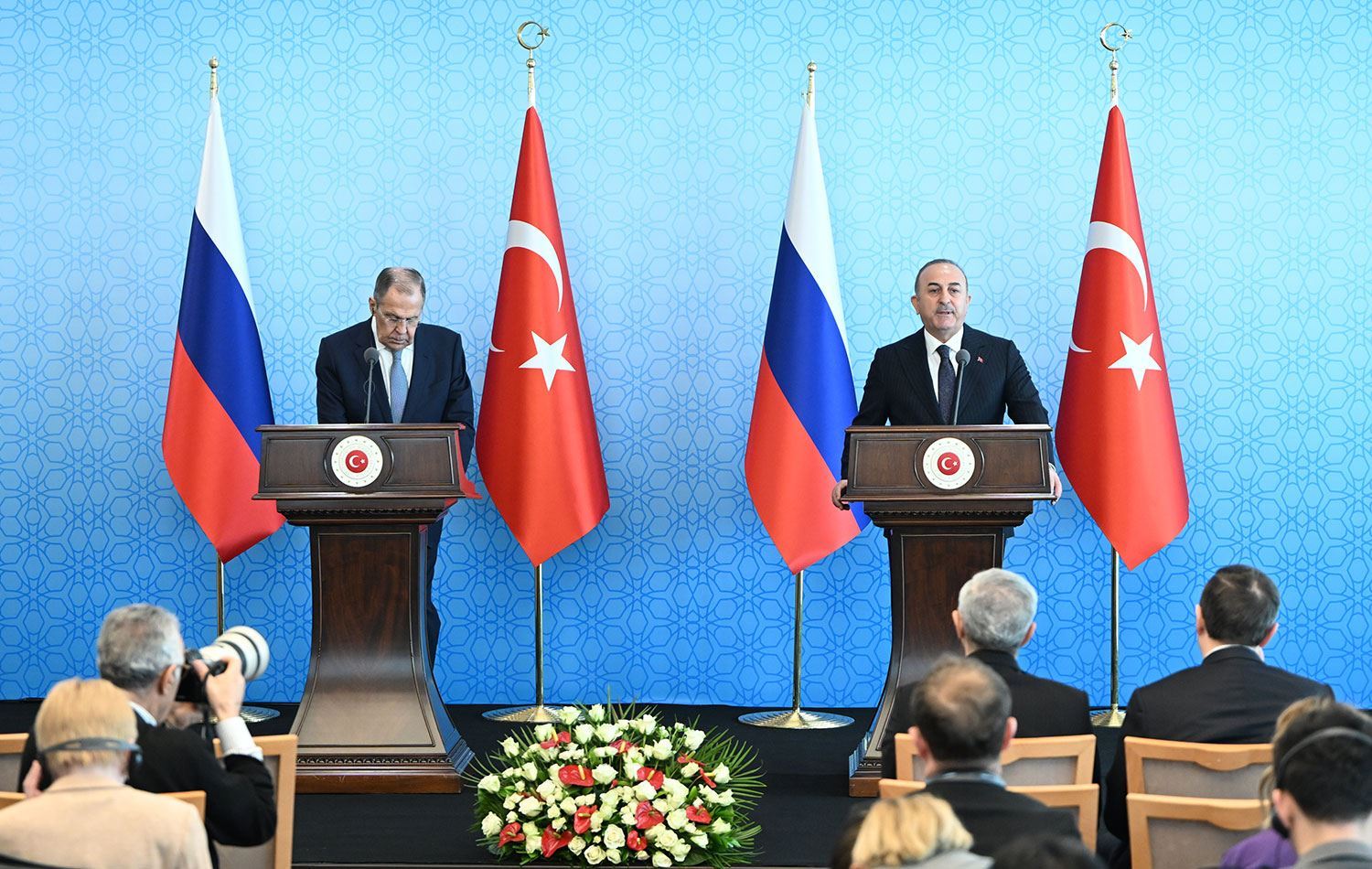 Wezîrê Derve yê Rûsyayê Sergey Lavrov û Wezîrê Derve yê Tirkiye Mevlut Çavuşoglu piştî hevdîtina li Kuliyeya Serokkomariyê îro Înê 7ê Nîsana 2023an li Enqerê civîneke rojnamevanî ya hevbeş saz kirin û herdu aliyan behsa naveroka hevdîtinê kirin.