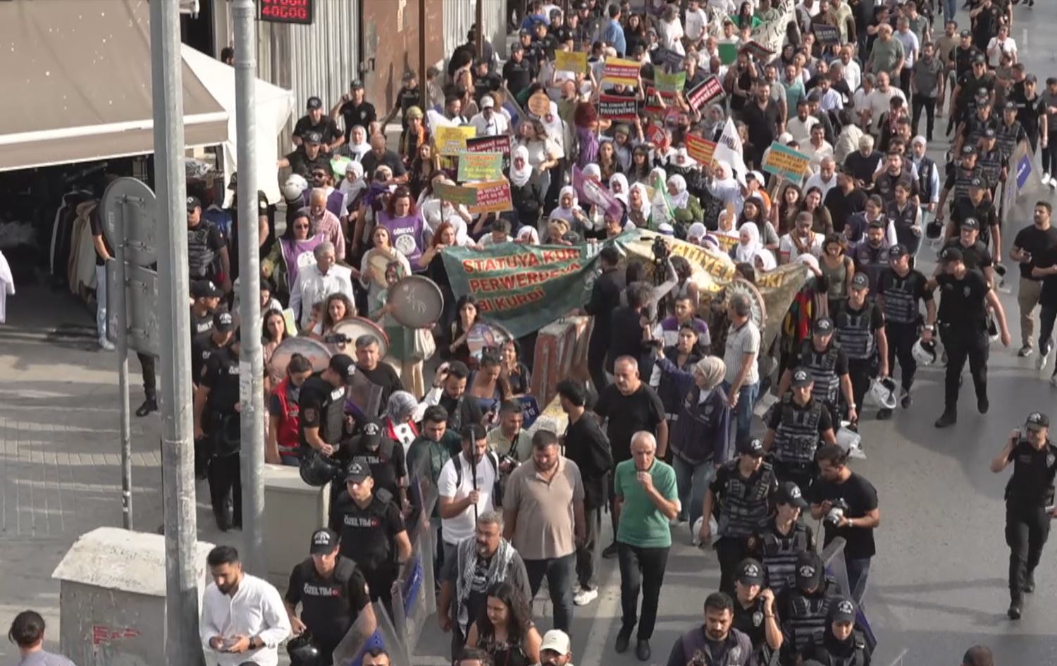 Di destê girseyê de pankartên bi Kurdî hebûn û bi tilîlî, stran û dirûşman daxwazên xwe anîn ziman.
