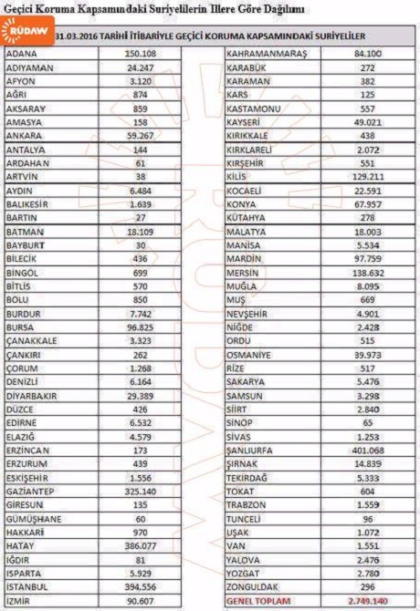 Belgeyeka fermî ya hikûmeta Tirkiyê ketiye destê Rûdawê ku tê de hejmara koçberên Sûrî yên li Tirkiyê hatiye nivîsandin her wiha li her bajarekî çend koçber bicîh bûne, nîşan dide.