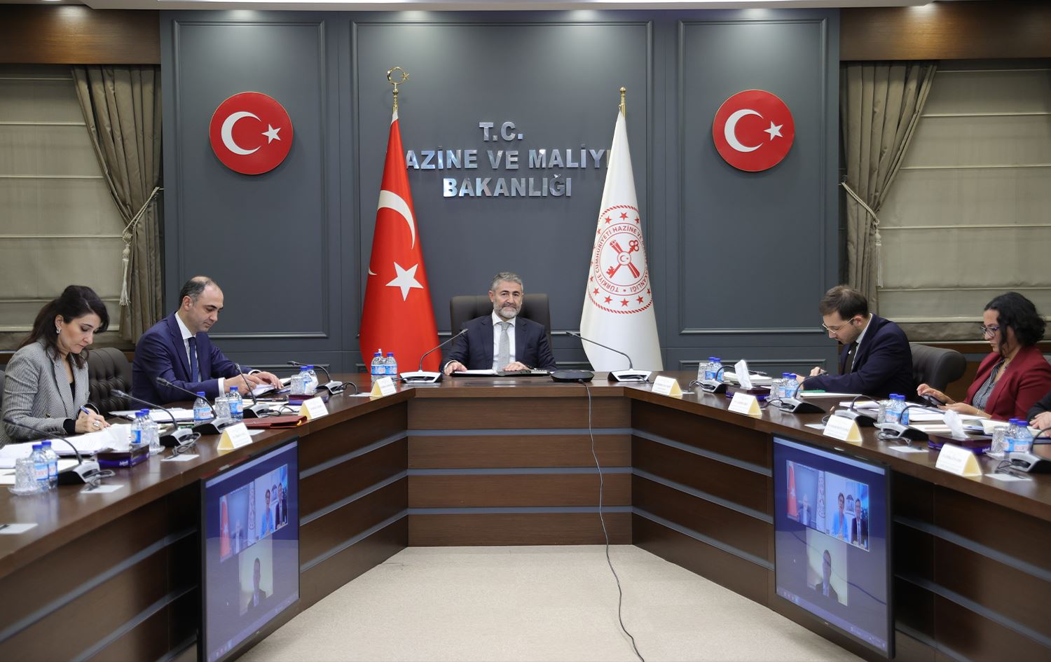 Serokê Bankeya Pêşketin û Îmarê ya Ewropayê (EBRD) Odile Renaud-Basso û Wezîrê Xezîne û Darayî yê Tirkiyê Nureddin Nebati online civiyan. Wêne: AA