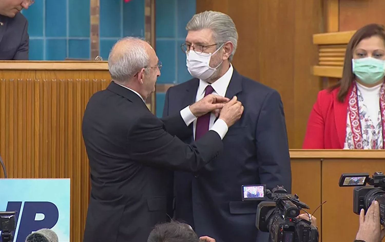 Serokê CHPê Kemal Kiliçdaroglu di Civîna Komê ya Parlementoyê de rozeta CHPê bi Cîhangîr îslam ve danî.