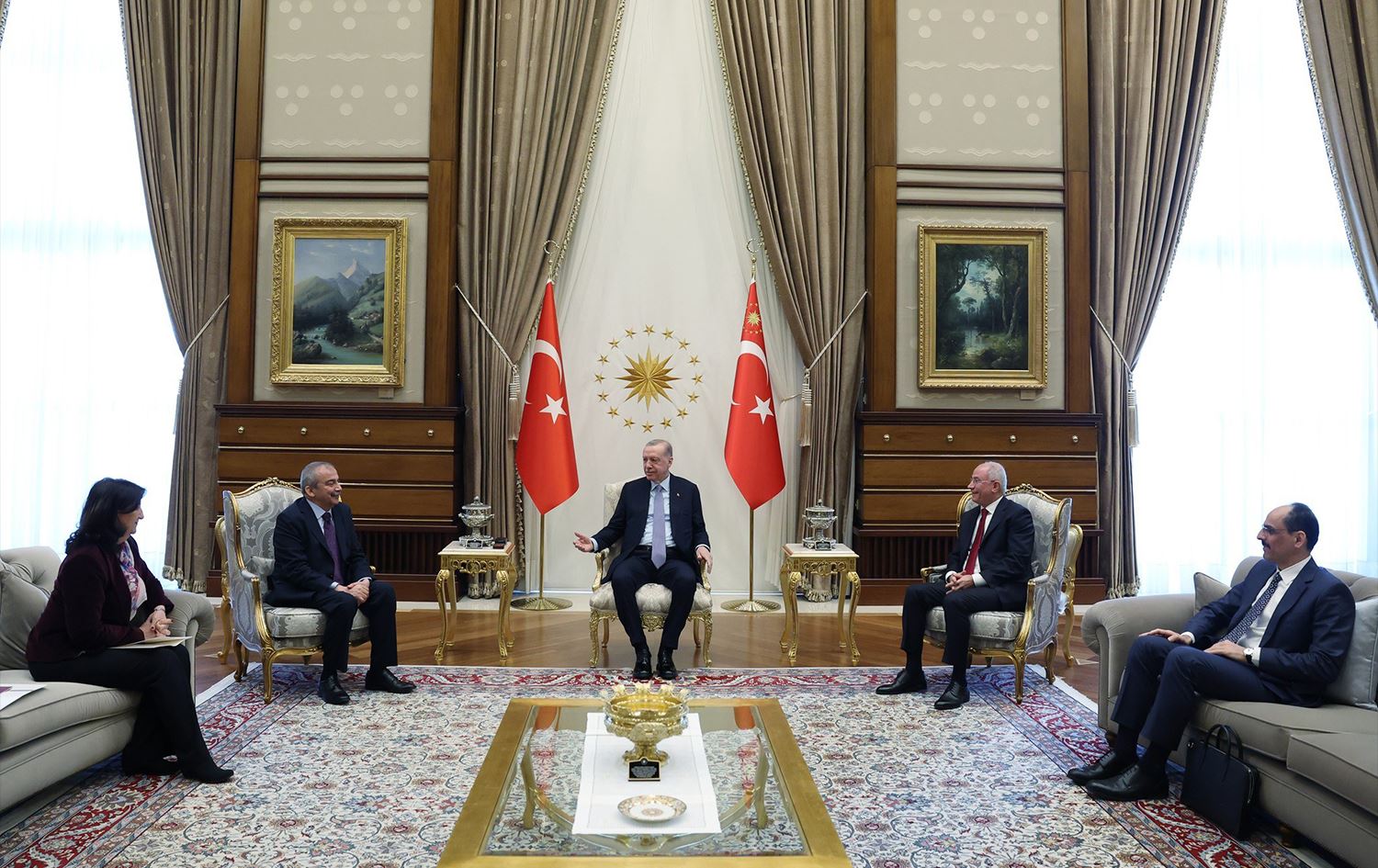 Hevdîtina Heyeta DEM Partiyê bi Erdogan re saetek û 25 xulekan berdewam bû. Di dema hevdîtinê de di gel Serokê Dezgeha Îstîxbarata Tirkiyeyê Îbrahim Kalin, Serokwekîlê AK Partiyê Efkan Ala jî amade bûn.