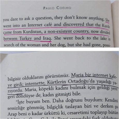 Paulo Coelho dema ku behsa Maria dike û dibêje: “Ew çûbû kafeya înternetê û keşf kiribû ku Kurd ji Kurdistanê hatine, dewleta ku nîne û niha di navbera Tirkiye û Iraqê de dabeşkirî ye.” Lê weşanxaneyê wergera vê beşê jî nekiriye.