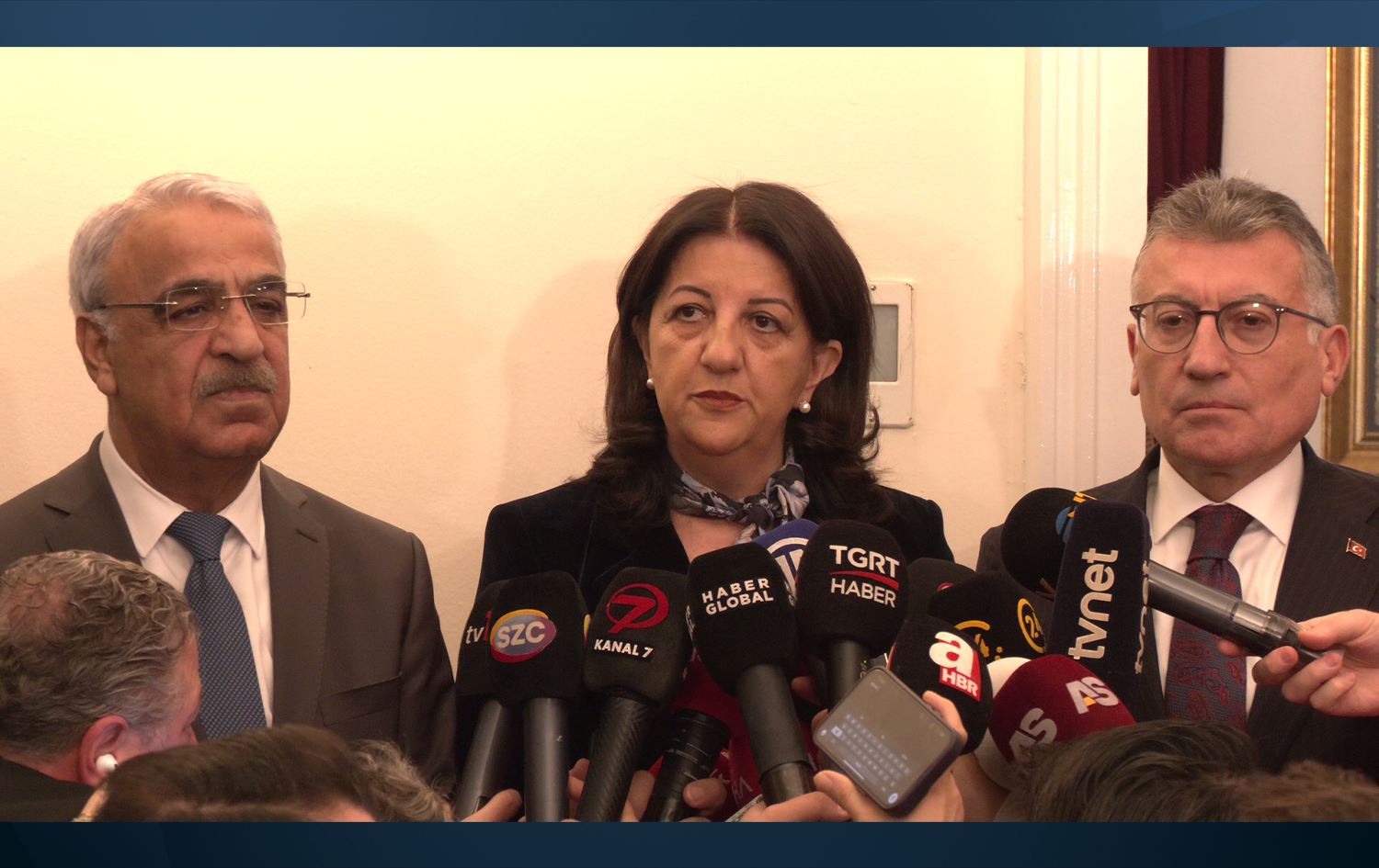 Endamên Heyeta Îmraliyê ya DEM Partiyê Pervîn Buldan, Ozgur Faîk Erol û Mîthat Sancar, di çarçoveya hevdîtinên partiyên siyasî yên "Pêvajoya Aştî û Civaka Demokratîk" de li Parlamentoyê bi şandeya AK Partiyê re hatin cem hev.