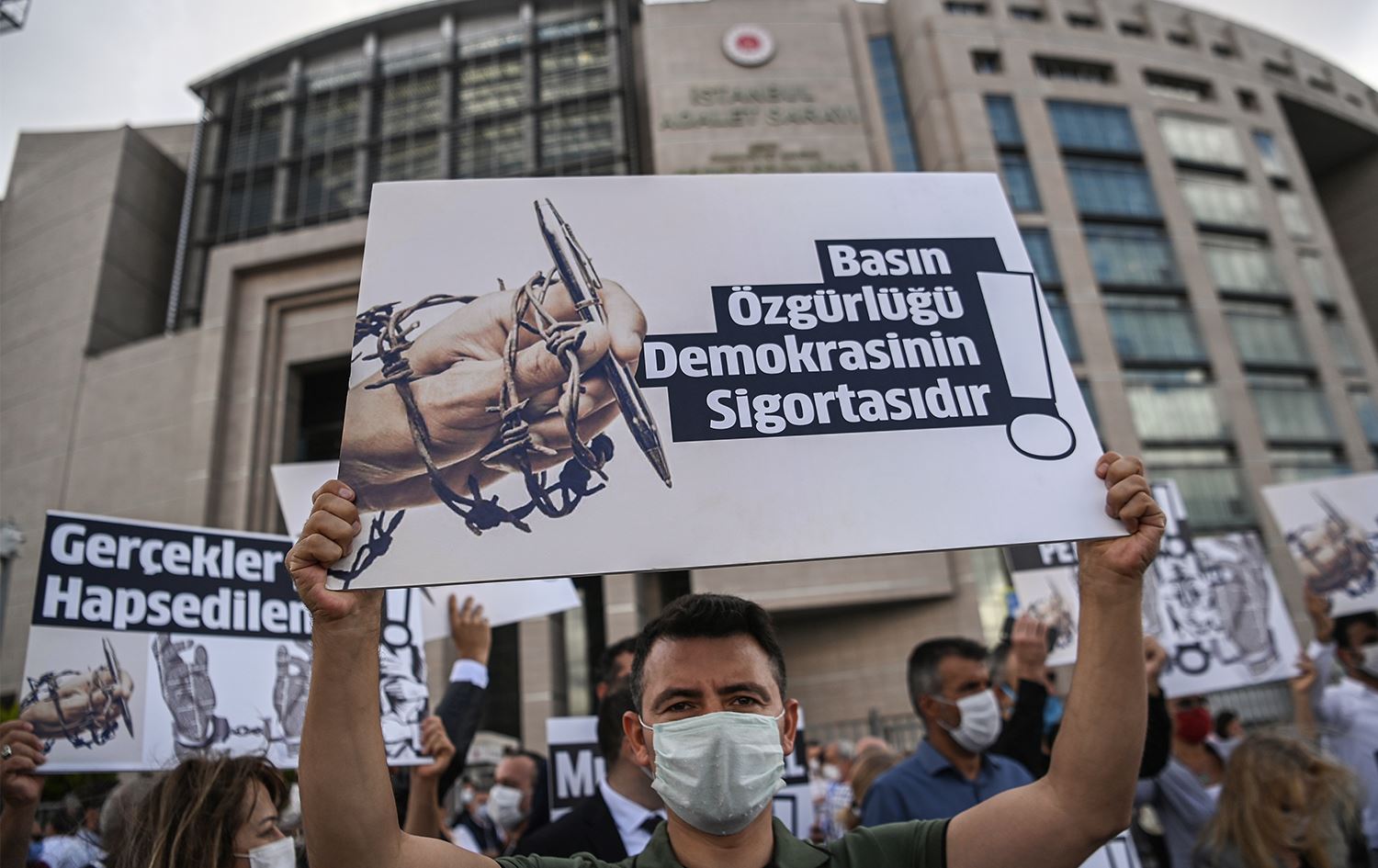 Xwepêşanderan di 9ê Îlona 2020an de afîşên bi nivîsa "Rojnamegerî sîgortaya demokrasiyê ye, li ber dadgeha Stenbolê berî dadgehîkirina rojnamevanên girtî hildane. Wêne: AFP