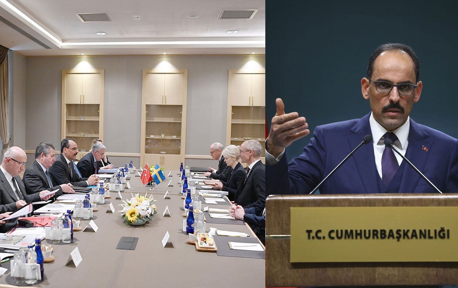 Berdevkê Serokkomariya Tirkiyê Îbrahîm Kalin wiha axivî “Me bi muxatabên xwe re derbarê wê qada ewlehiyê ya nû ku piştî şerê Ukraynayê çêbûye û endamatiya wan a bo NATOyê û di vê çarçoveyê de jî nîgeranî û daxwazên Tirkiyê yên ewlehiyê ku serokkomarê me anîne rojevê bi berfirehî gotûbêj kirin. Ez bi kurtî peyamên ku me dane wan ji we re bibêjim. Di serî de NATO hevpeymaniyeke ewlehiyê ye û ne rêxistineke hevkariya aborî û tişteke din e.