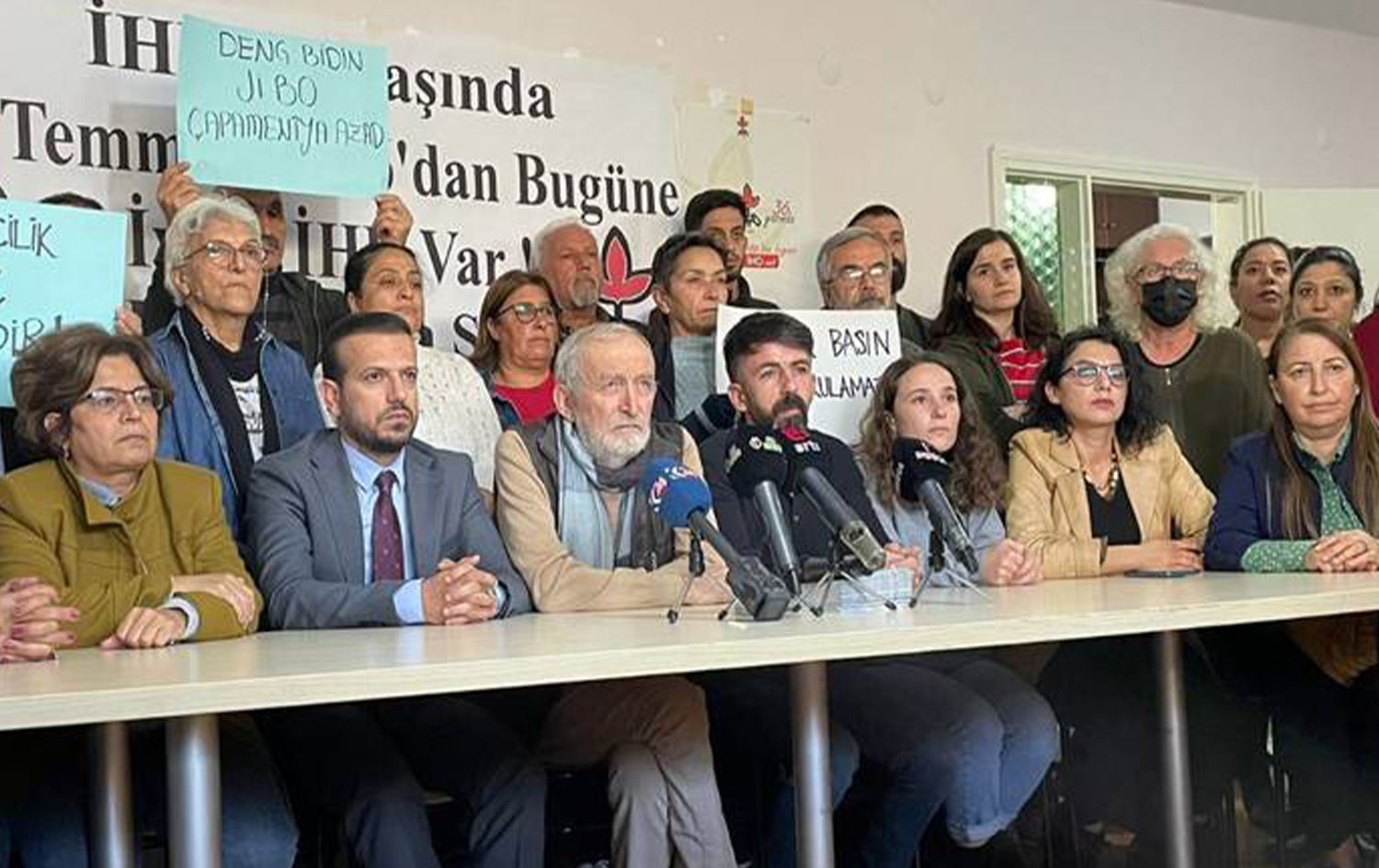 Hewlêr (Rûdaw)- Beşek ji sazî û komeleyên rojnamevanan, li Şaxa Enqere ya Komaleya Mafên Mirov (ÎHD) a Tirkiyê destserkirina 11 rojnamevanên Ajansa Mezoptamya û JINEWSê bi daxuyaniyekê çapemeniyê şermezarkirin. Rojnamevanên ku beşdarî daxuyaniya çapemeniyê bûne piştevaniya xwe bo hevpîşeyên xwe yên hatine destserkirin ragihandin.