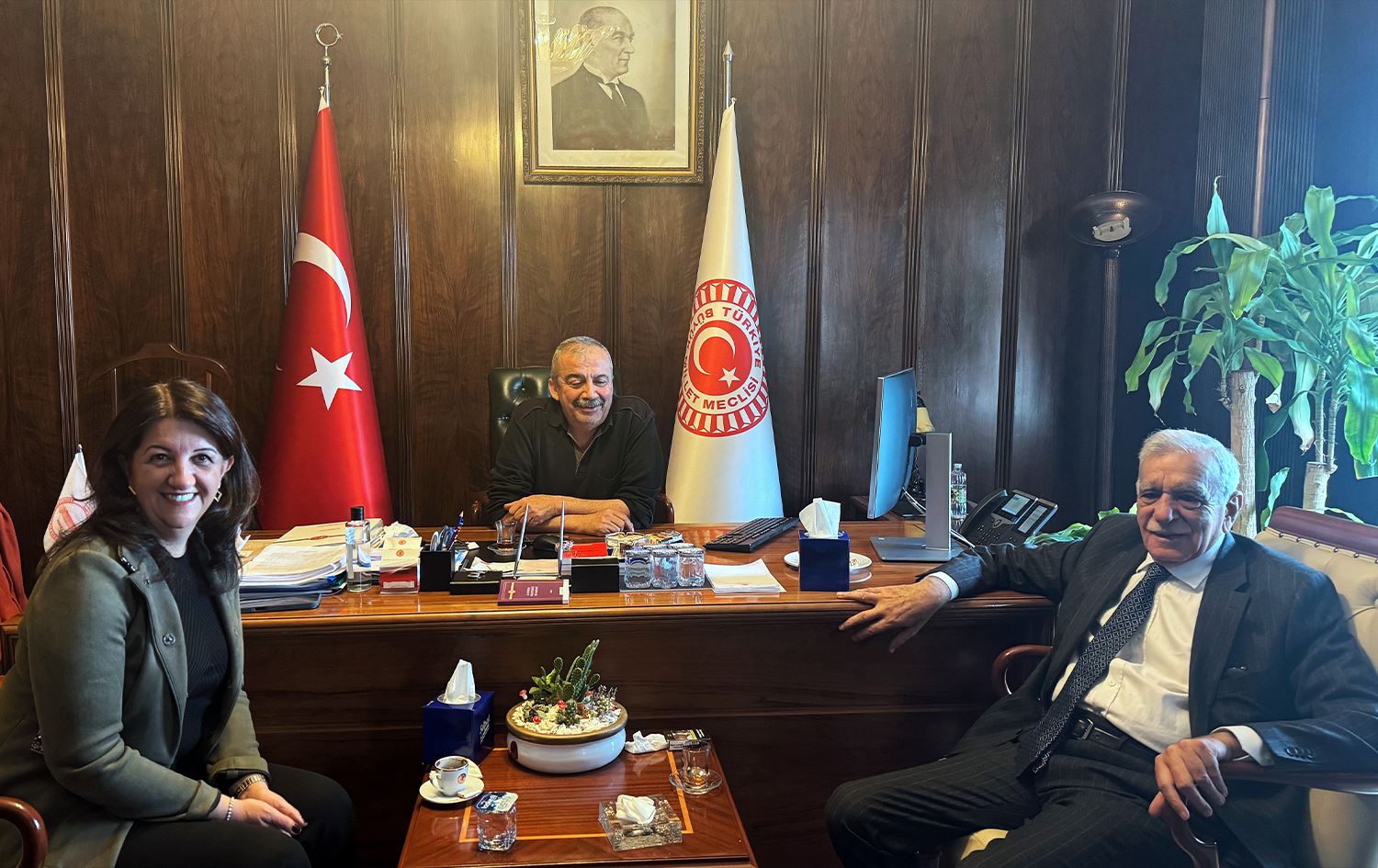 Ahmet Turk û Parlamentera Wanê ya DEM Partiyê Pervîn Buldanê îro beriya civîna koma DEM Partiyê ya li Parlamentoya Tirkiyeyê çûn serdana Serokwekîlê Parlamentoyê yê DEM Partiyê Sirri Sureya Onder.