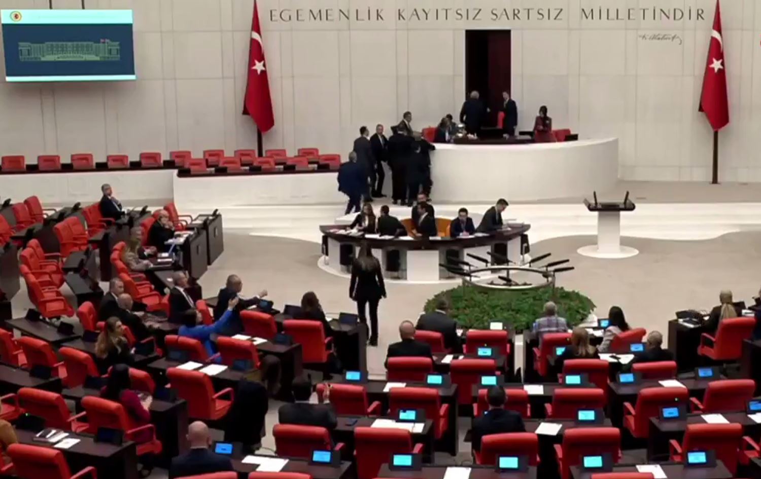 Parlamenterên DEM Partiyê di rûniştina Parlamentoya Tirkiyeyê de bi çepikan û lêdana li maseyan danîna qeyûm protesto kir.