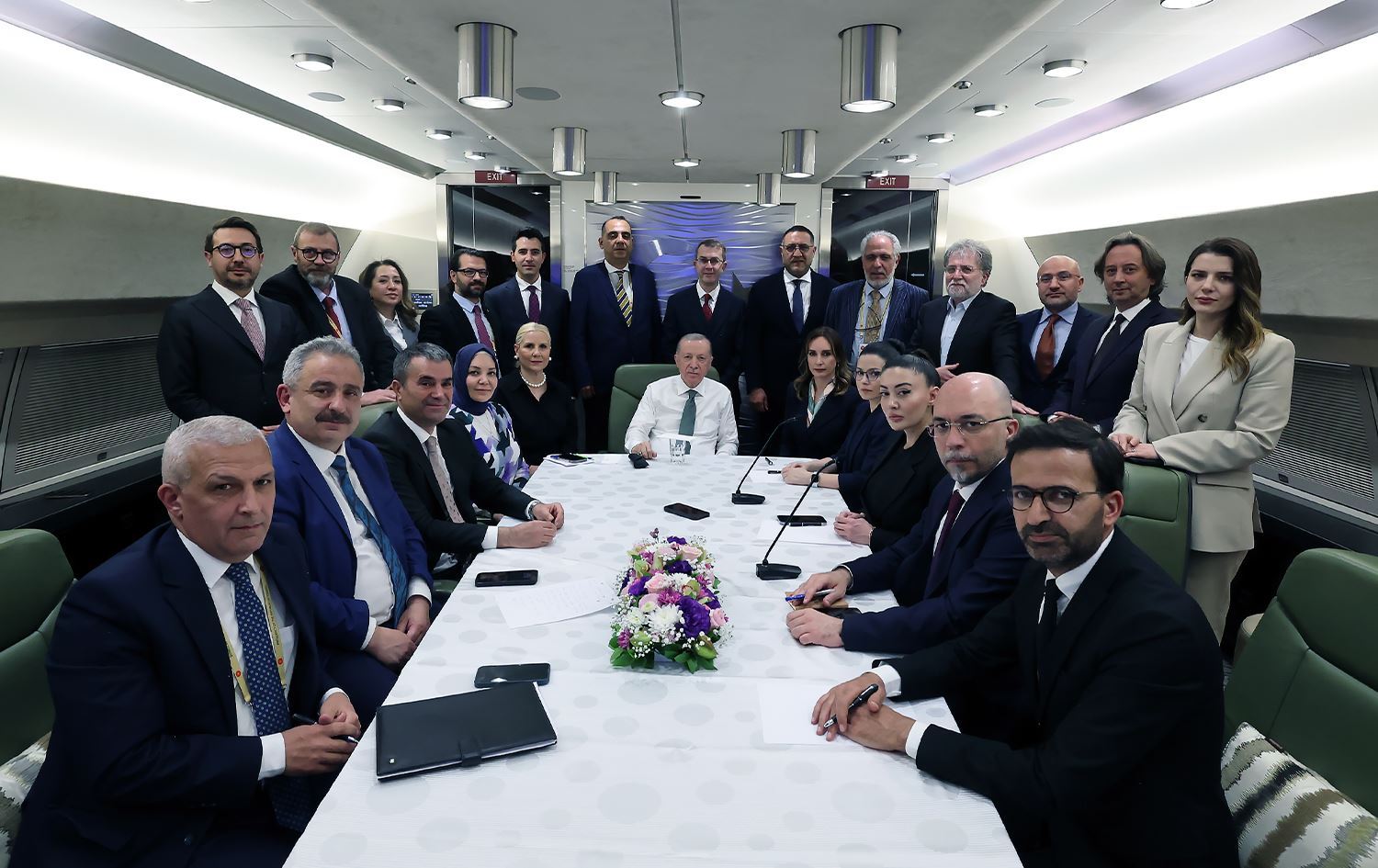 Serokkomarê Tirkiyeyê Recep Tayyip Erdogan di vegera ji serdana xwe ya Îtalyayê de, di nav firokeyê de bersiv da pirsên rojnamegeran.
