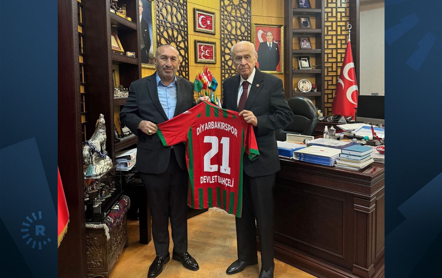 “Serokê Rêxistina me ya Diyarbekirê Miktat Aslan û Serokê tîma Diyarbekirsporê Bedirhan Akyol çûn serdana Serokê me Birêz Devlet Bahçelî.”