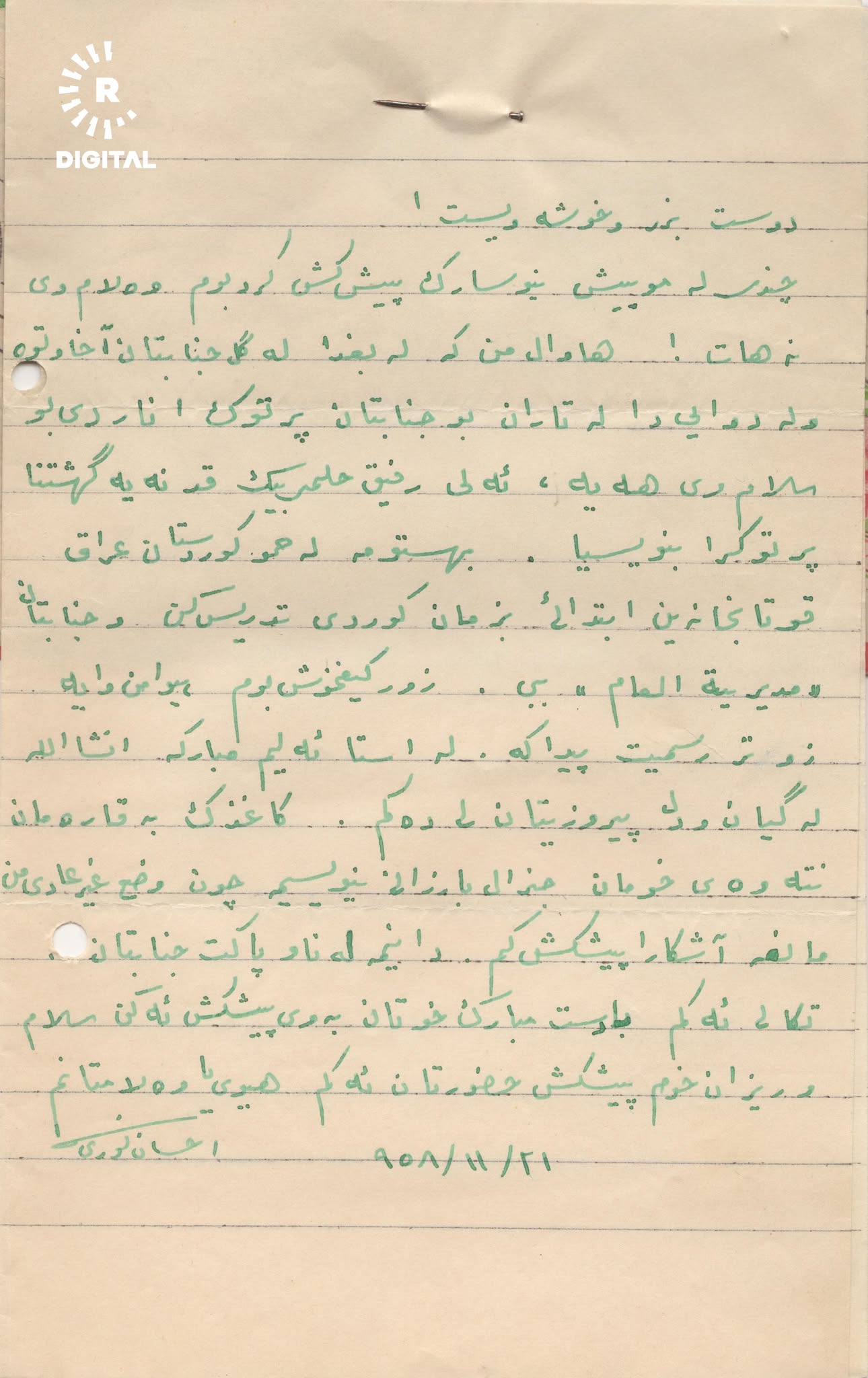 Li vir em orîjînala wê nameya serkirdeyê Kurd Îhsan Nûrî Paşa, rêberê Serhildana Agiriyê ya 21ê Çiriya Paşîn a 1958an ku ji mamoste Refîq Hilmî re şandiye wekî xwe belav dikin. Hevdem min name anî ser rastnivîsîna niha.